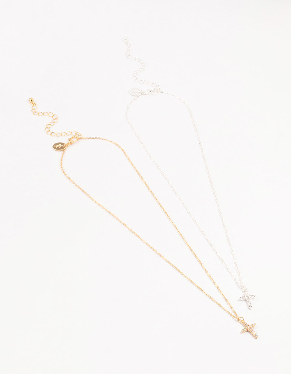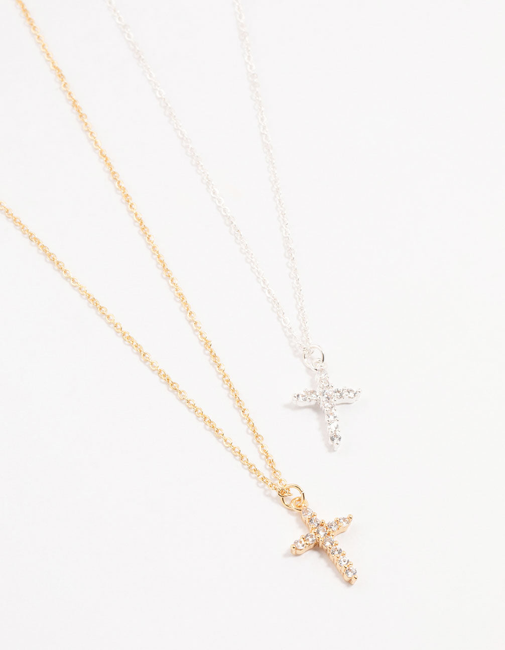 Embrace mixed metal chic with this set of two necklaces! Perfect for layering, they feature gold and silver plated cross pendants, adding a playful twist to your style and making great gifts.