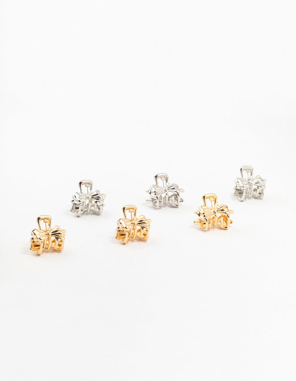 Up your look with these Mixed Metals Mini Bow Clips, blending metallic accents for a playful touch in any hairstyle. With a sleek claw clip design, they secure your locks stylishly, offering an effortlessly glamorous vibe.