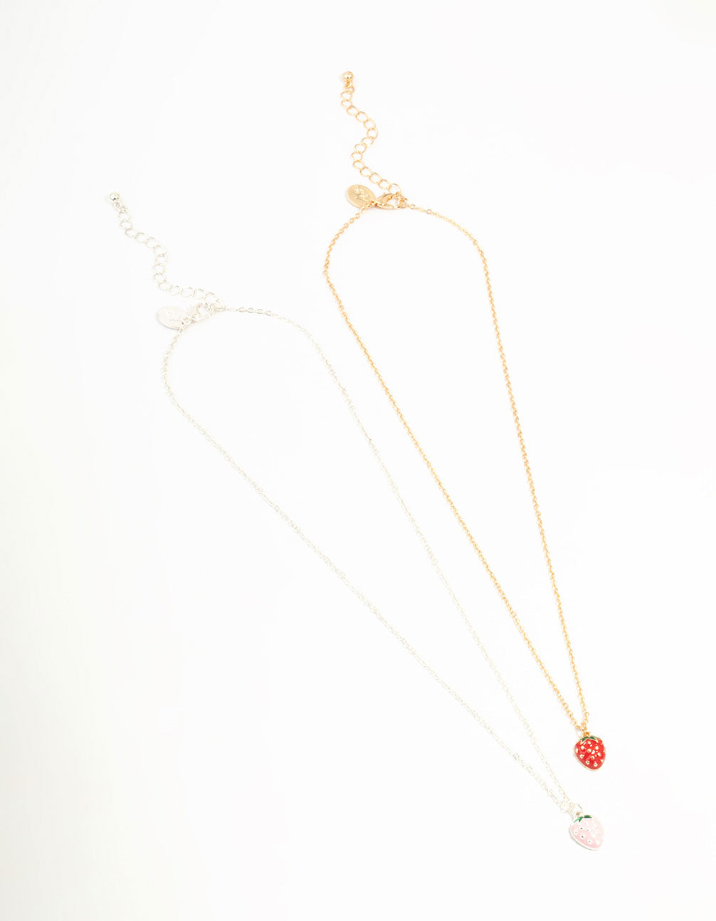 Surprise someone special with a charming set of necklaces! With gold and silver-toned bases and delightful strawberry motifs, these necklaces are perfect for sharing—keep one for yourself and gift the other.