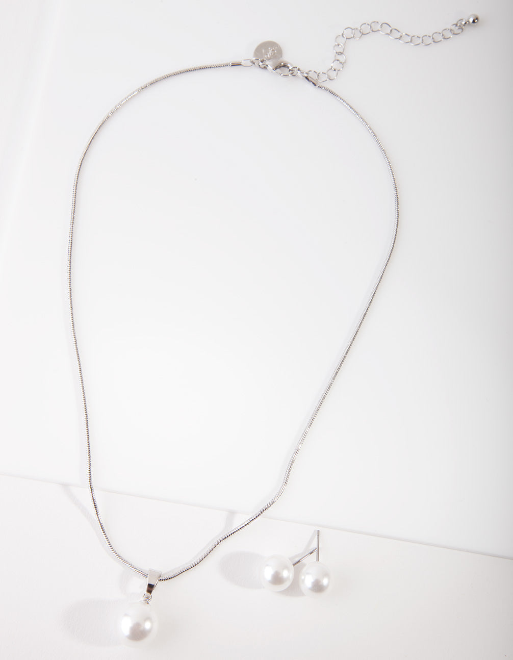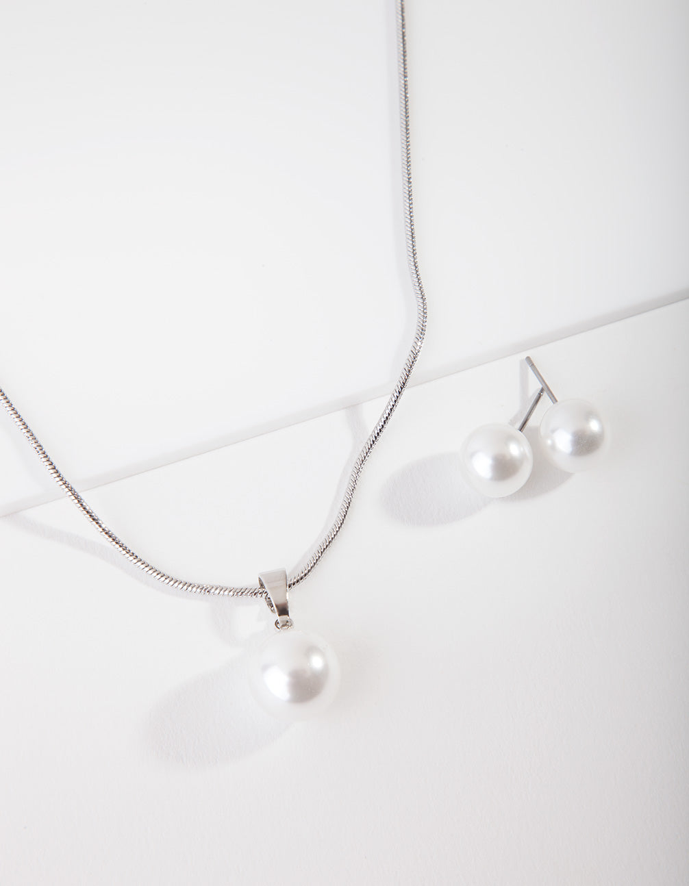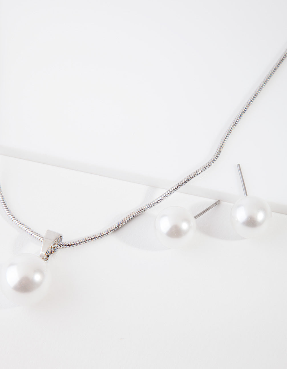 This pearl designed necklace and earring set has a large pearl setting with a silver tone.