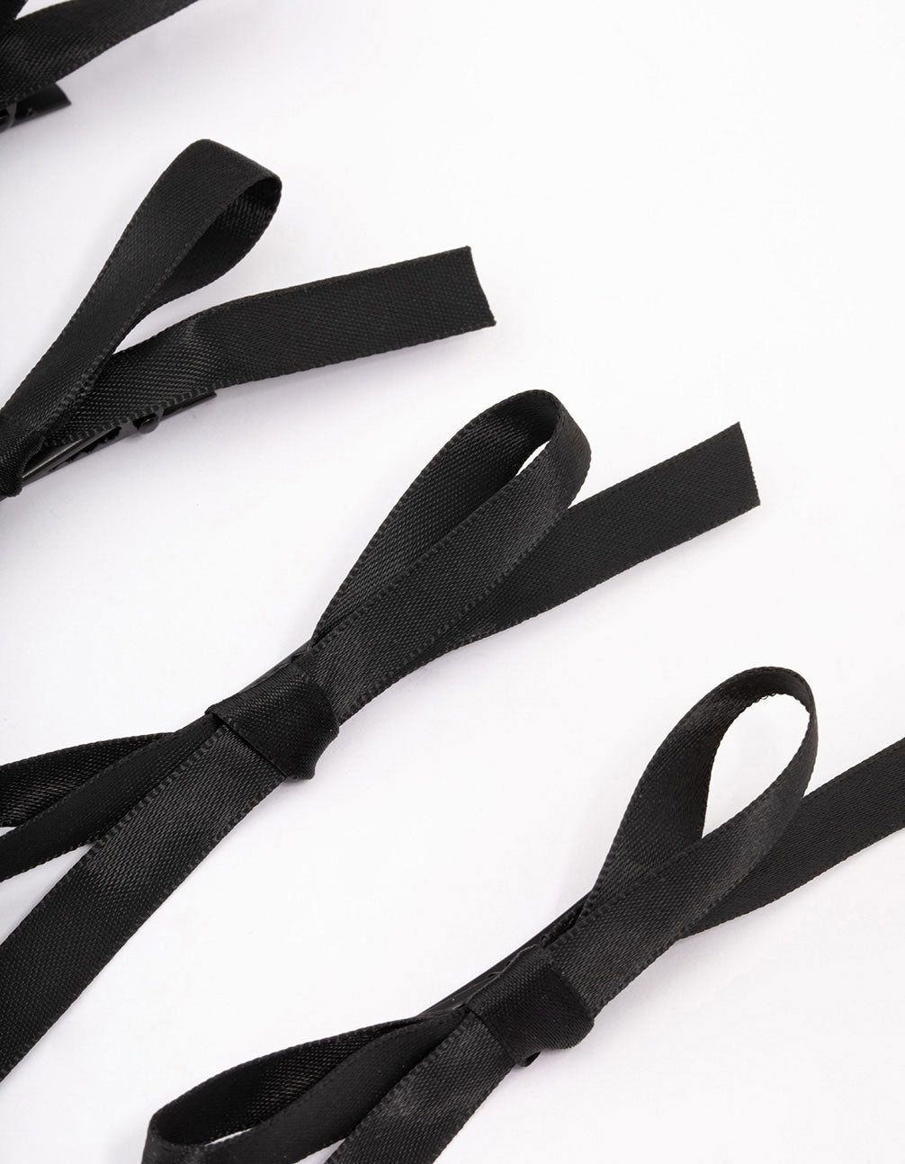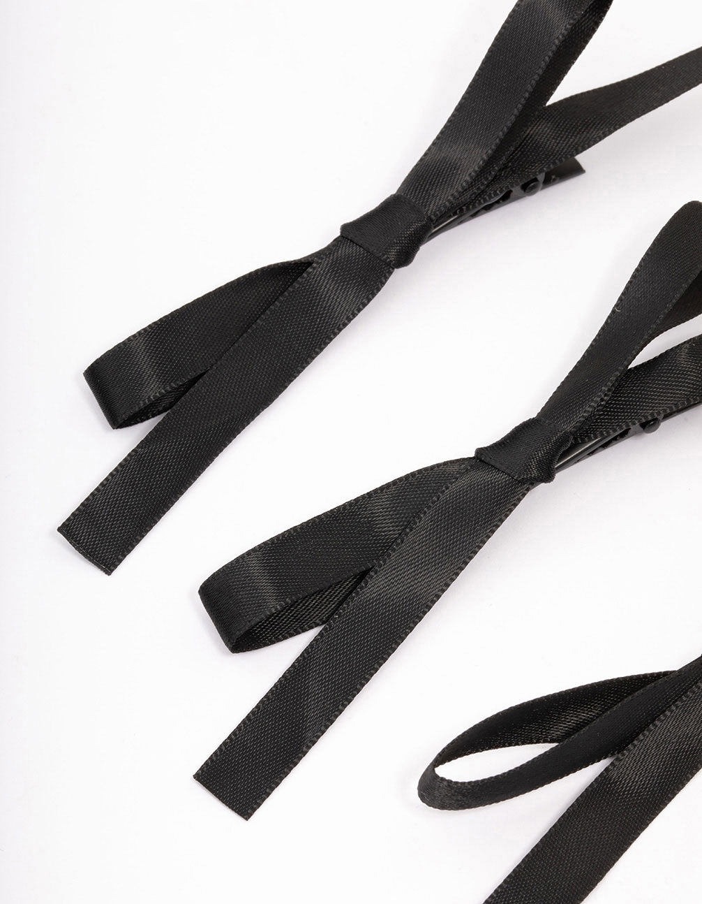 - This hair accessory pack contains four, thin black hair bows for a coquette-inspired finish to your look.
