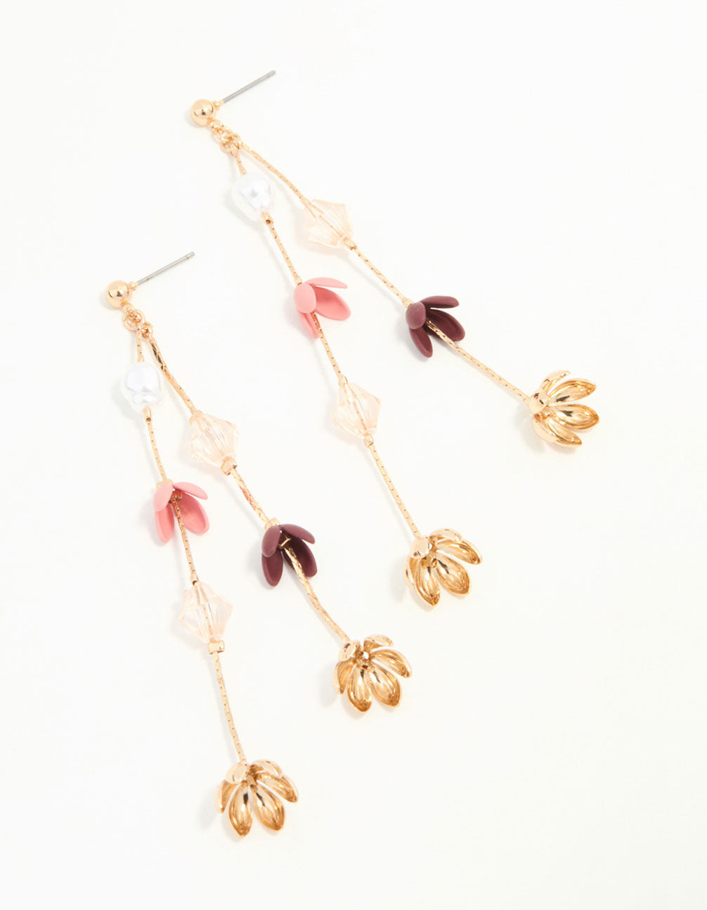 Add garden-inspired glam to your style with these stunning drop earrings. Featuring vibrant pink, gold, and purple flower motifs on a chic thin chain, they're perfect for bringing a delightful dose of floral flair to any outfit.