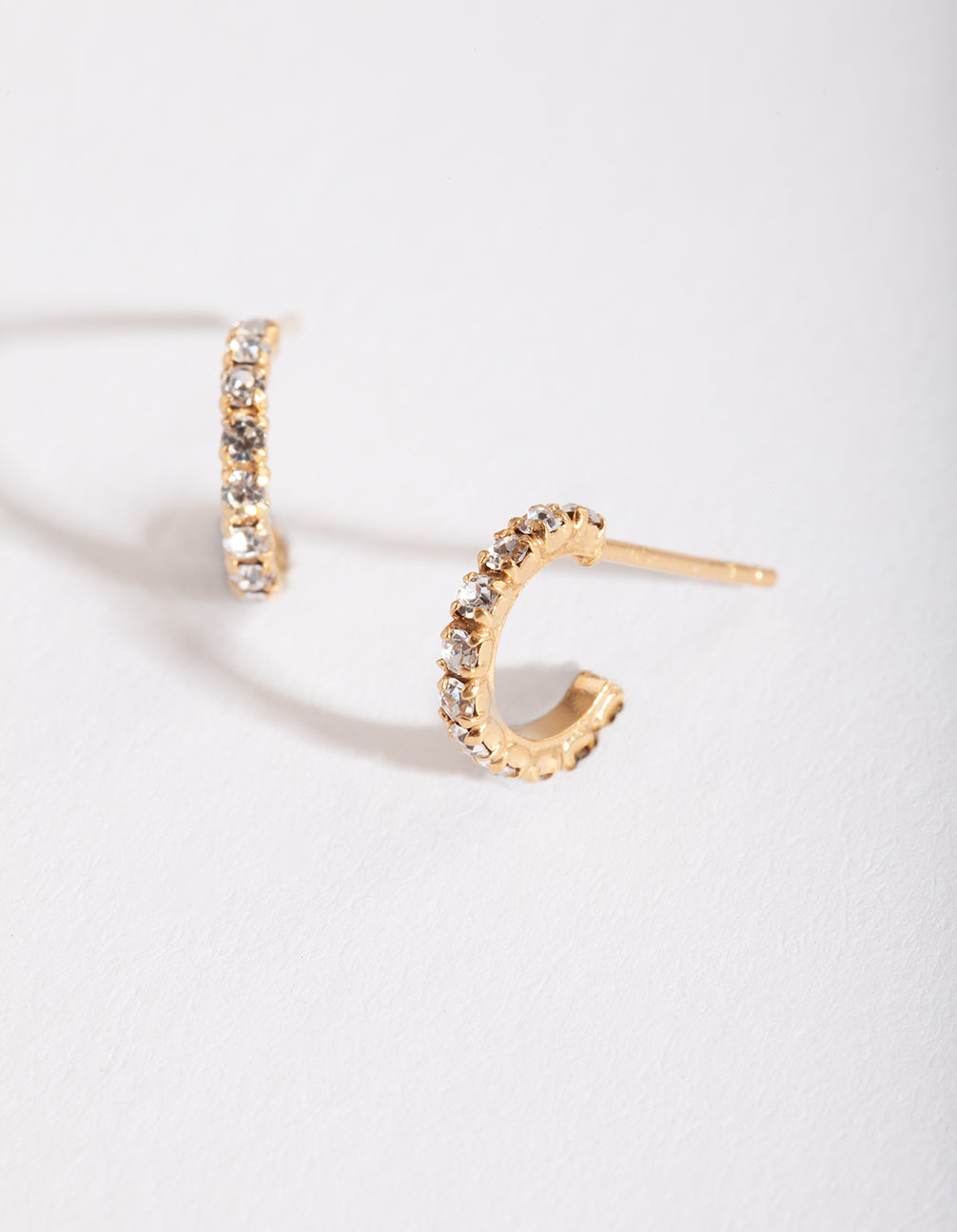 Gold plated sterling silver styles are a great way to round out your collection. These earrings boast a diamante embellished mini huggie design.