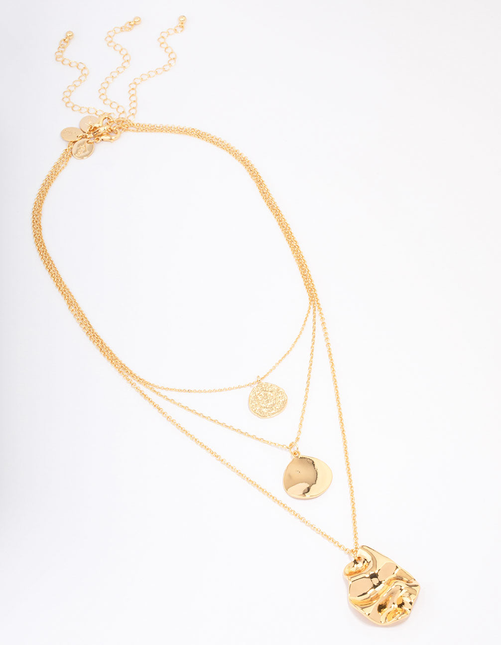 - This Gold Plated Trio Layered Molten Disc Necklace is perfect for adding interest to your neckline.