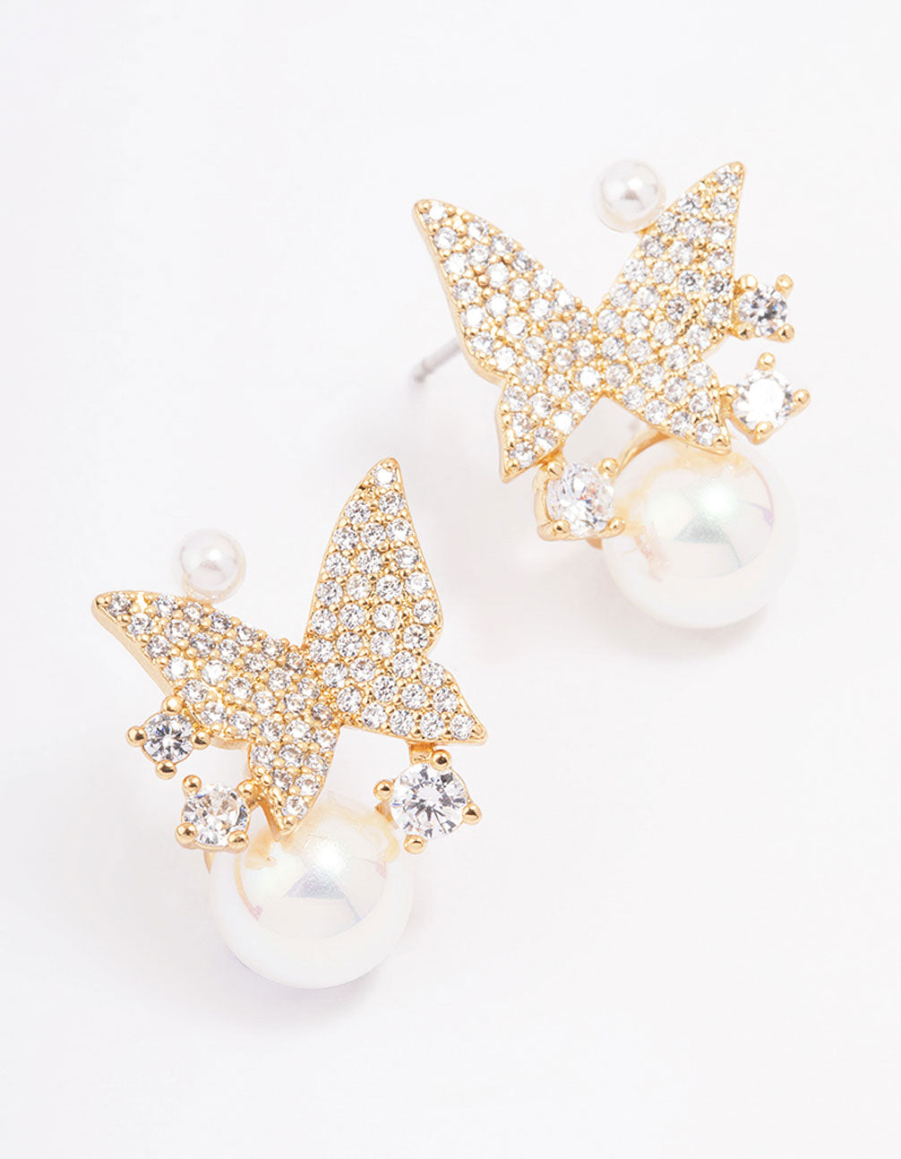 Gold Plated Pearl & Butterfly Cubic Zirconia Stud Earrings