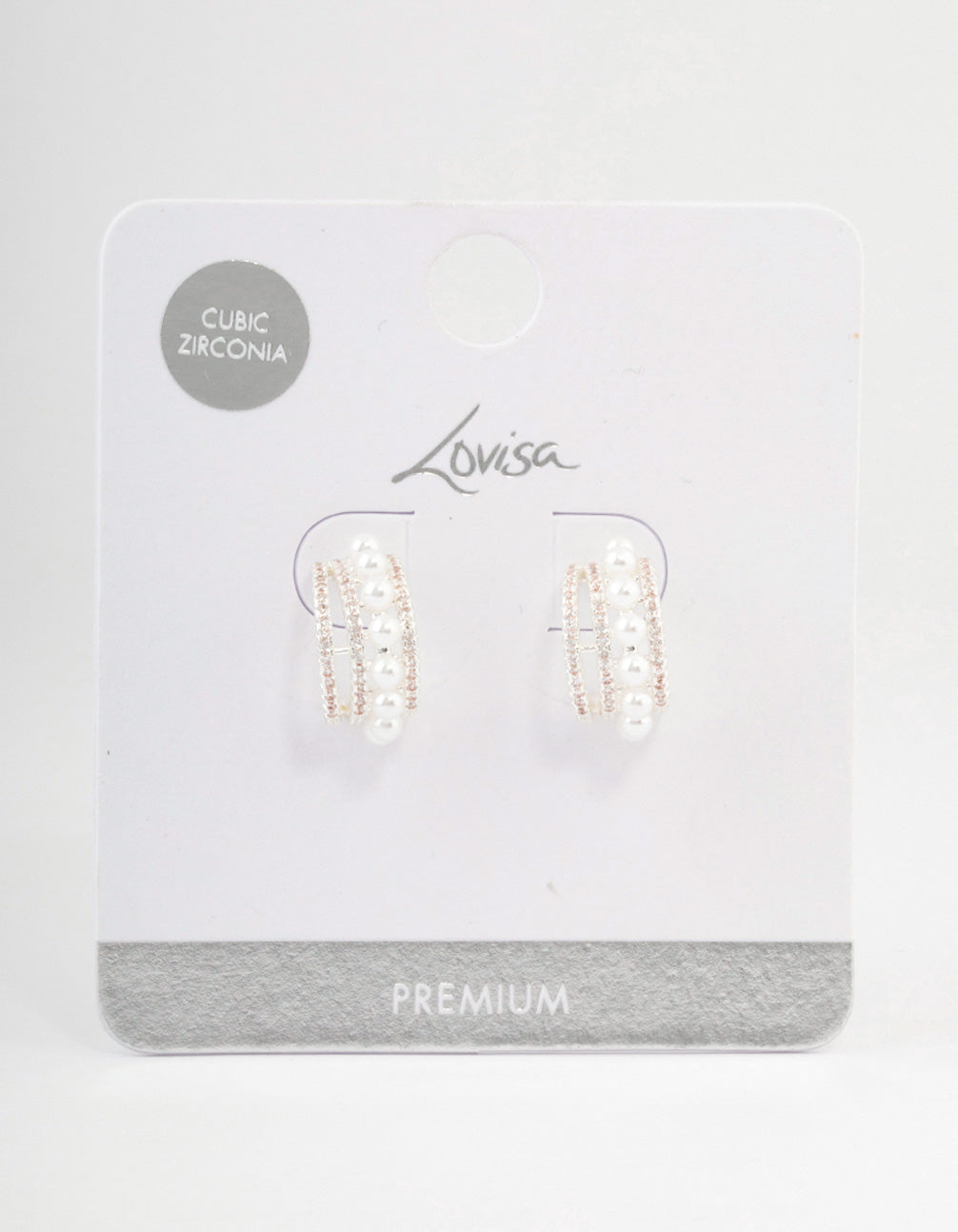Silver Plated Cubic Zirconia Pearl Layered Small Hoop Earrings
