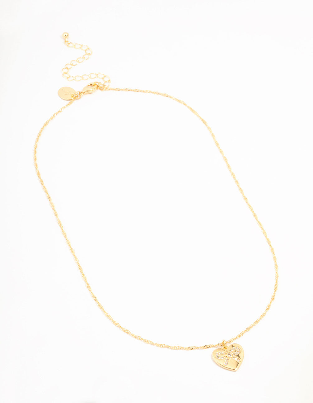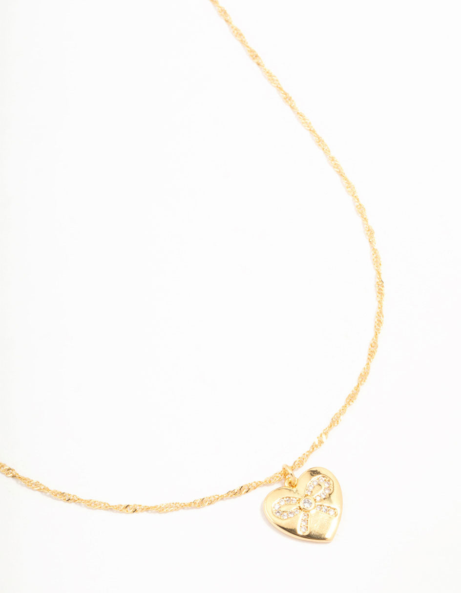 Embrace coquette inspired charm with this pendant necklace. This pendant necklace is crafted from gold plated brass and includes a heart locket style feature with a cubic zirconia bow feature for an enchanting romantic coquette inspired look.
