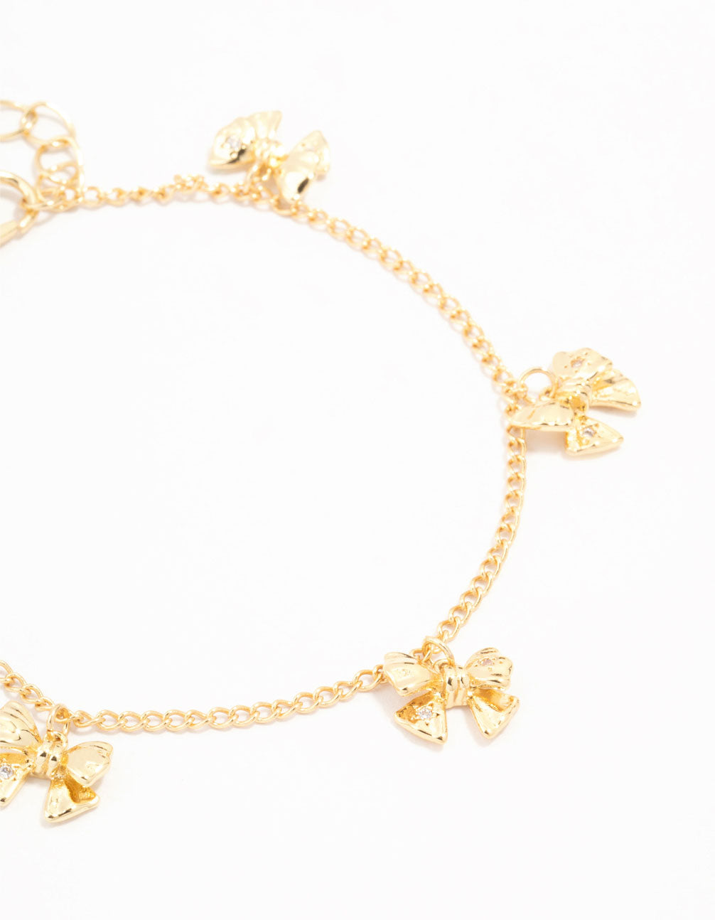 Create the perfect coquette look with this stunning gold plated brass bracelet. It features mini bow charms for that flirty and exquisite look.