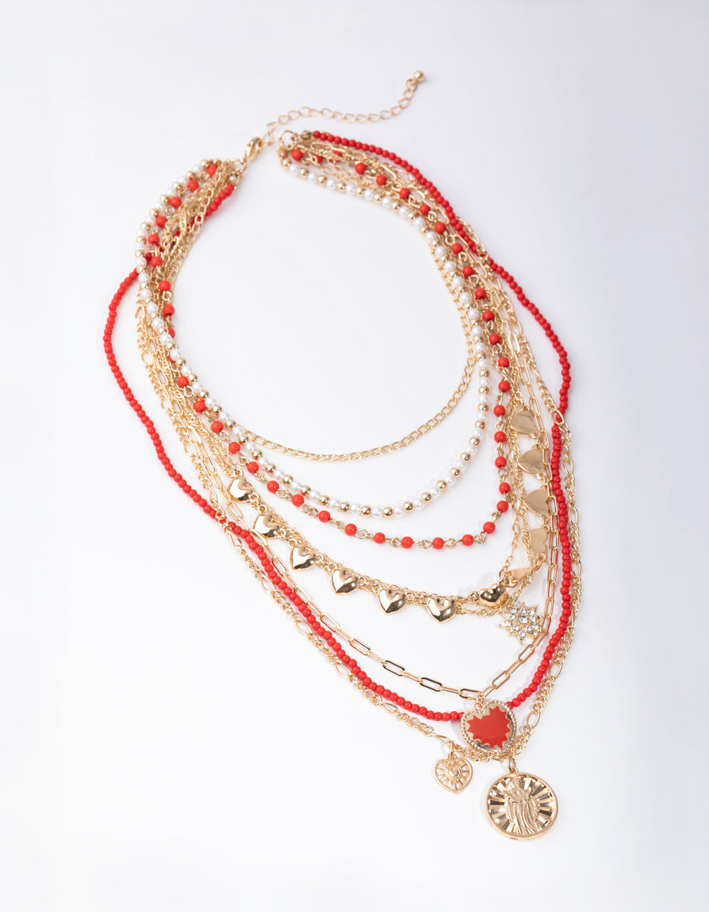 We think you'll love this layered necklace! This piece boasts nine rows, adorned with vibrant beads and funky pendants on a gold-toned setting. Wear this necklace alone for an impactful look.