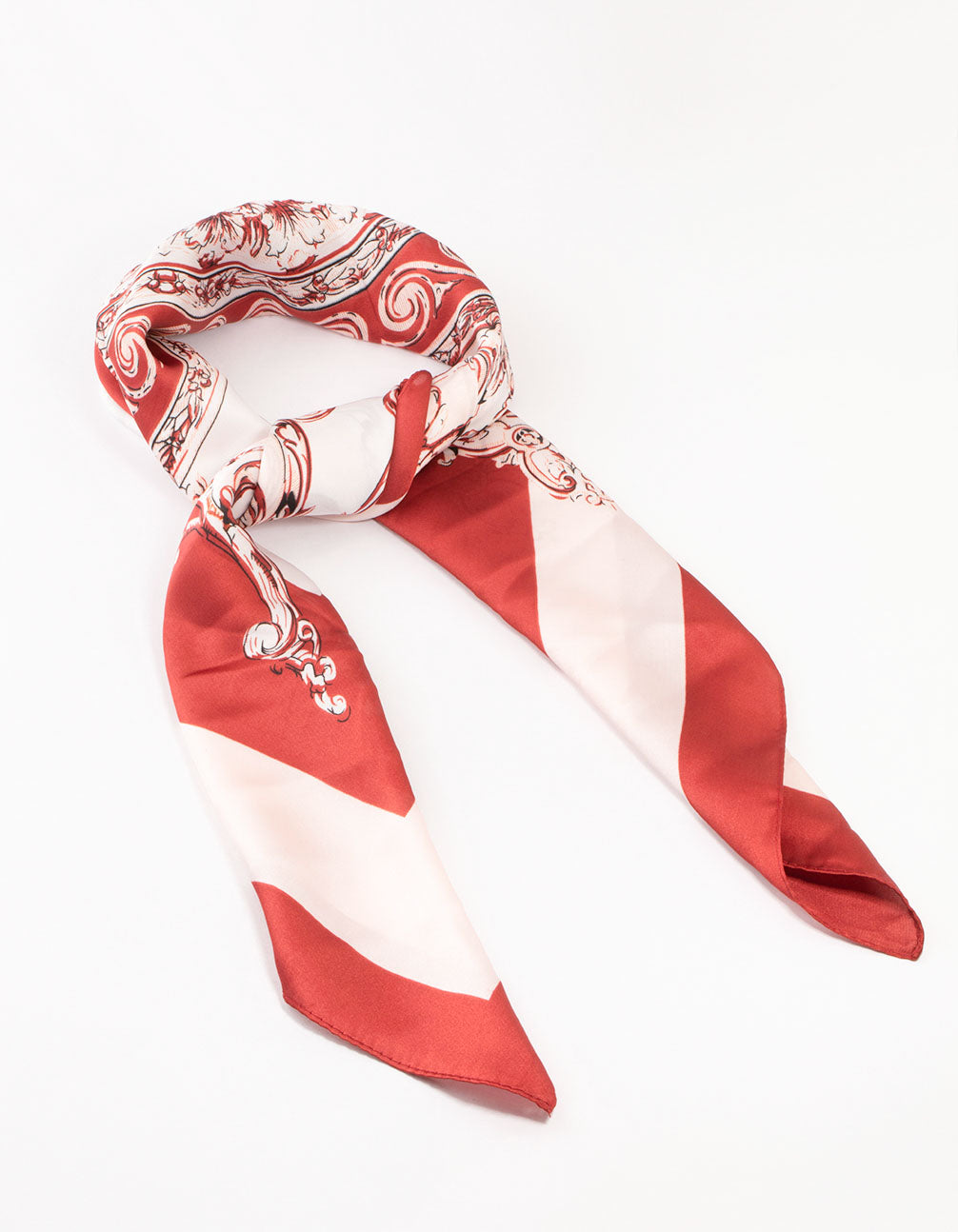 Scarves and bandanas are timeless trends. Add a printed scarf for a fun, playful finish. This red and white regal print elevates your look from drab to fab, ideal for parties, picnics, or festivals.