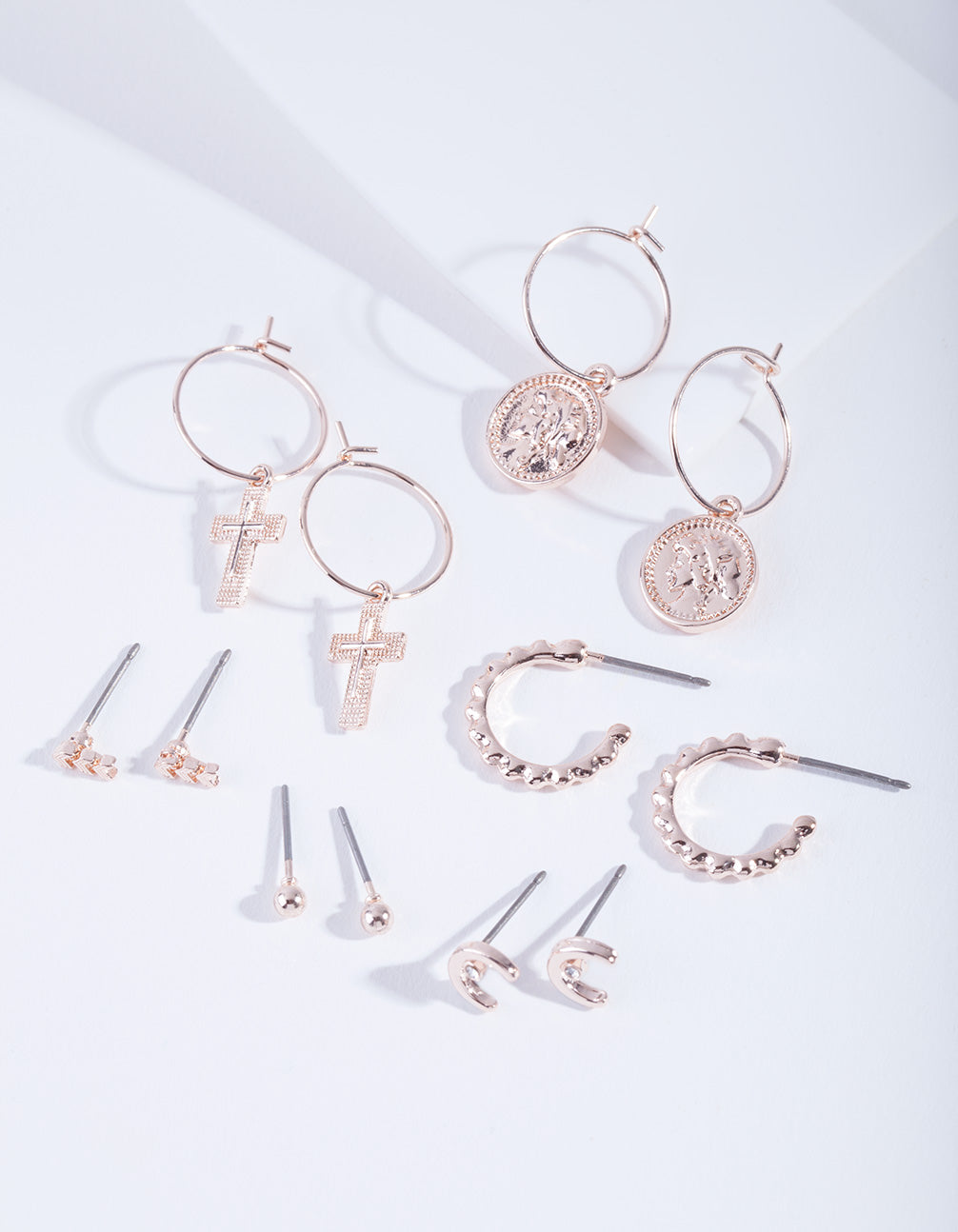 Can't decide on just one? You don't have to! This style features a variety of earrings so you can mix and match to suit your mood. This earring pack boasts rose-gold-toned designs.