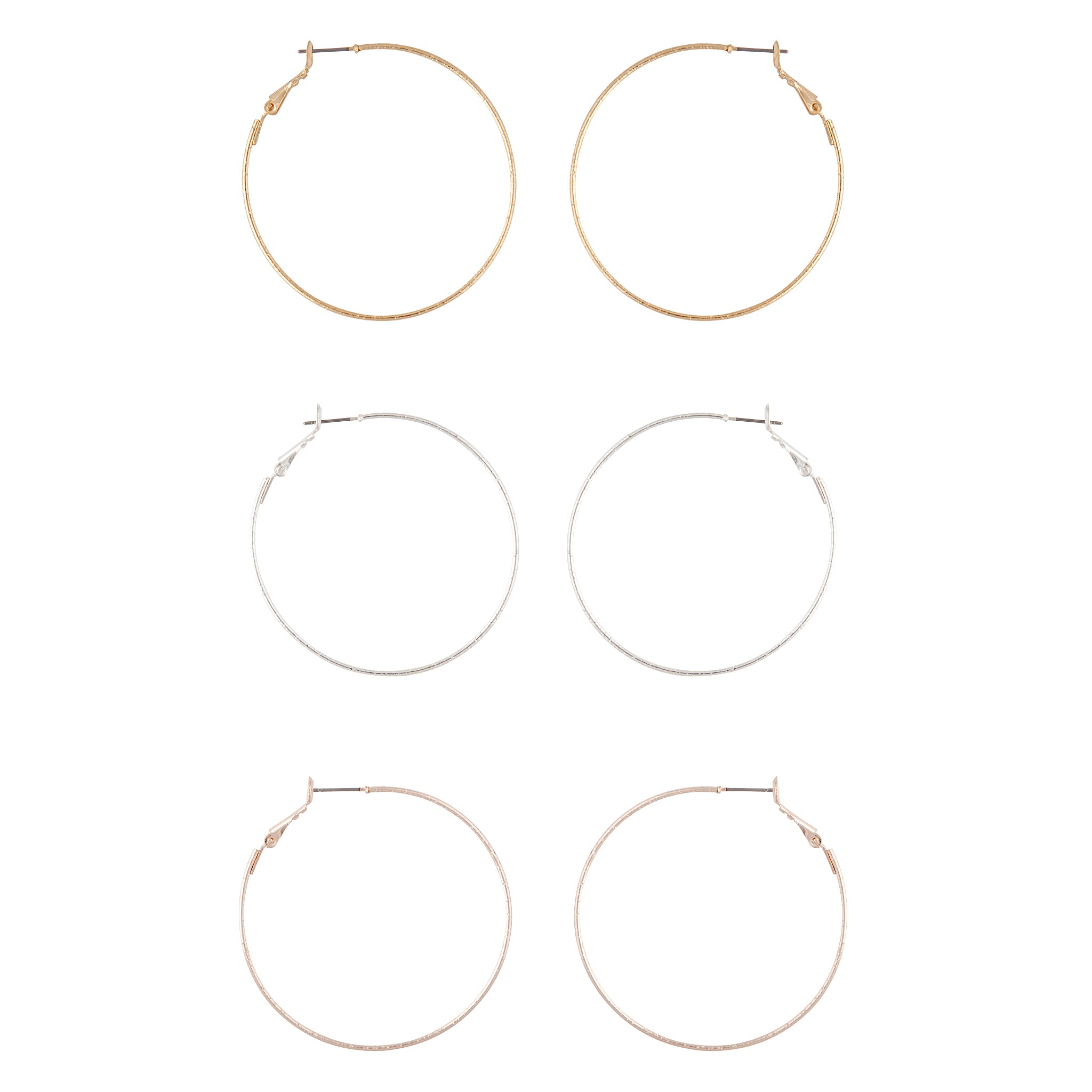 This trio of hoop earrings comes with a textured finish in gold, rose gold and silver tones.