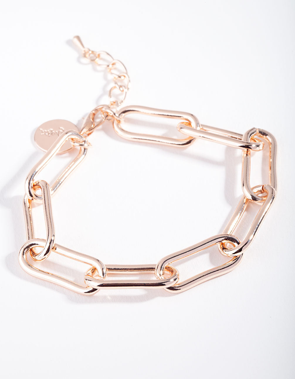 We love a bracelet stack! Mix it with other styles or wear it alone for a simple addition to your daily ensemble. This bracelet boasts a rectangle chain link design in a rose gold tone.