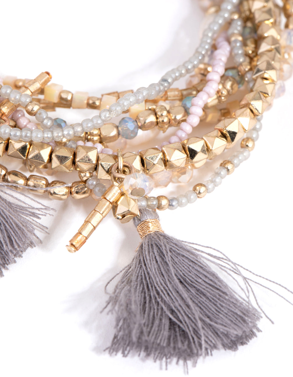 Start a funky bracelet stack together with this lovely set. It features nine stretch bracelets in a mix of gold, grey and neutral tones. They feature freshwater pearls for extra design, and grey tassel details to inspire intrigue.