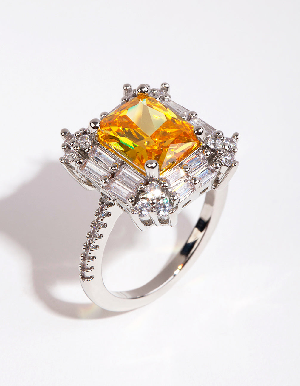 Sparkle with all the facets of a true diamond with cubic zirconia. These lab-created crystals are engineered to be indistinguishable from diamonds to the naked eye. This beautiful silver-toned ring features a radiant-cut cubic zirconia in a citrine hue.