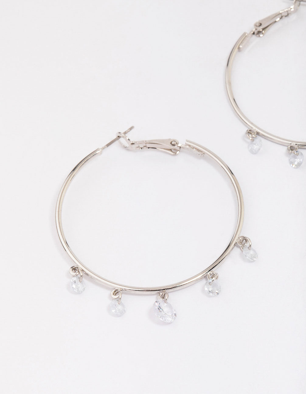 Add detail to your look with these simple, silver-toned hoops. These hoop earrings feature a large, sleek profile adorned with dangling cubic zirconia crystals for an embellished touch.