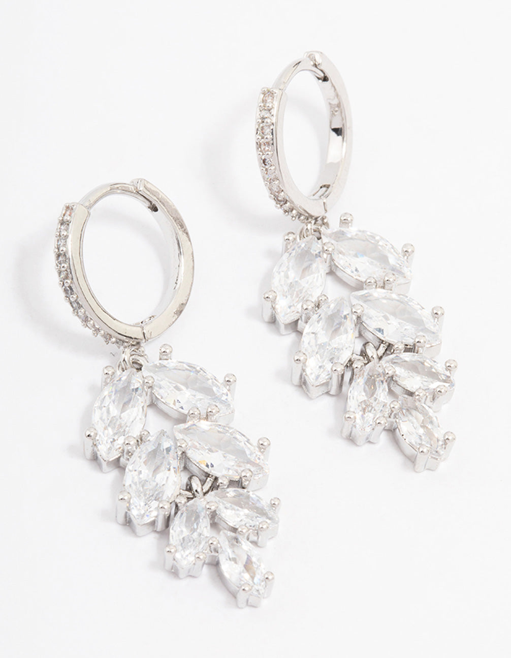 Silver Cubic Zirconia Leaf Huggie Drop Earrings