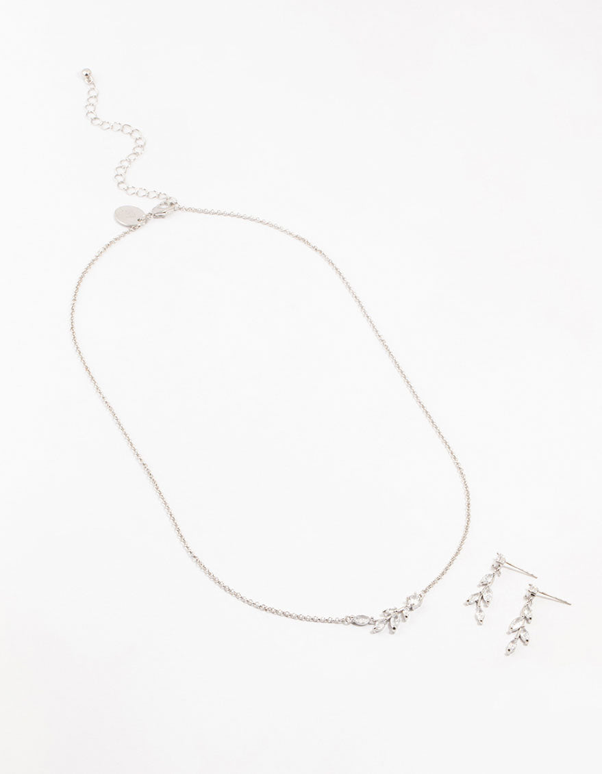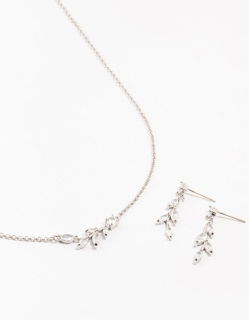 Bring a touch of tranquility and style with this chic olive branch set. It features a silver-based necklace and matching drop earrings, both twinkling with olive branch charm. Perfect for making a stunning yet understated statement.