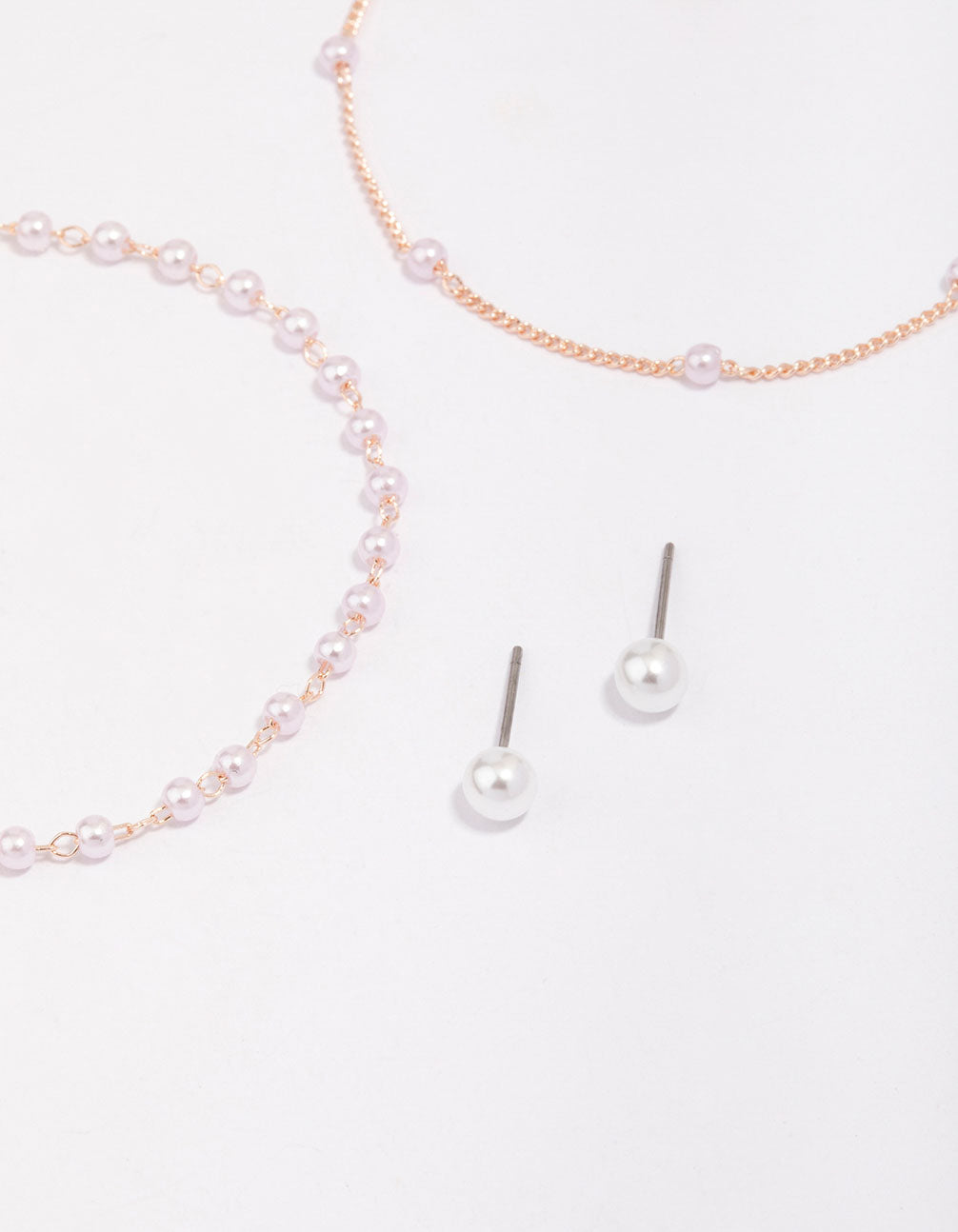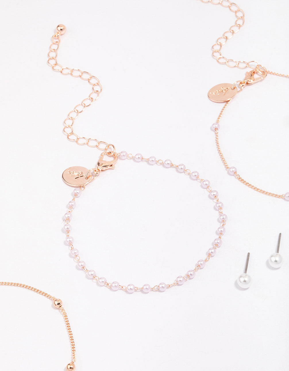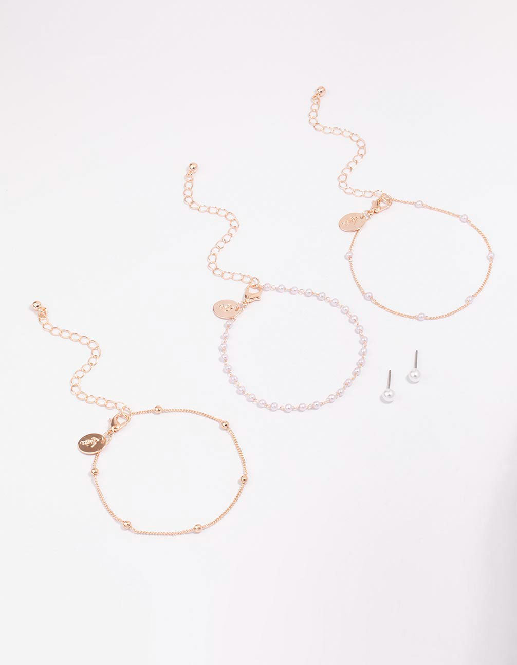 Complete your stack with this gorgeous, rose gold jewellery set. This jewellery set includes three individual bracelets and a set of adorning stud earrings, perfect for adding detail to your look!