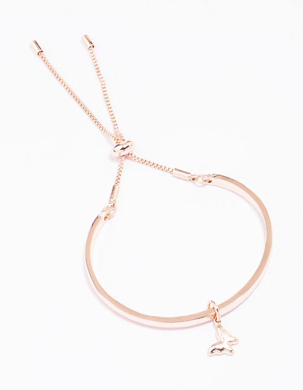 For a timeless addition to your stack, style this gorgeous rose gold bracelet. This toggle bracelet features a fine, solid band adorned with a delicate butterfly charm for an on-trend finish. This bracelet features an adjustable toggle clasp for simple styling!