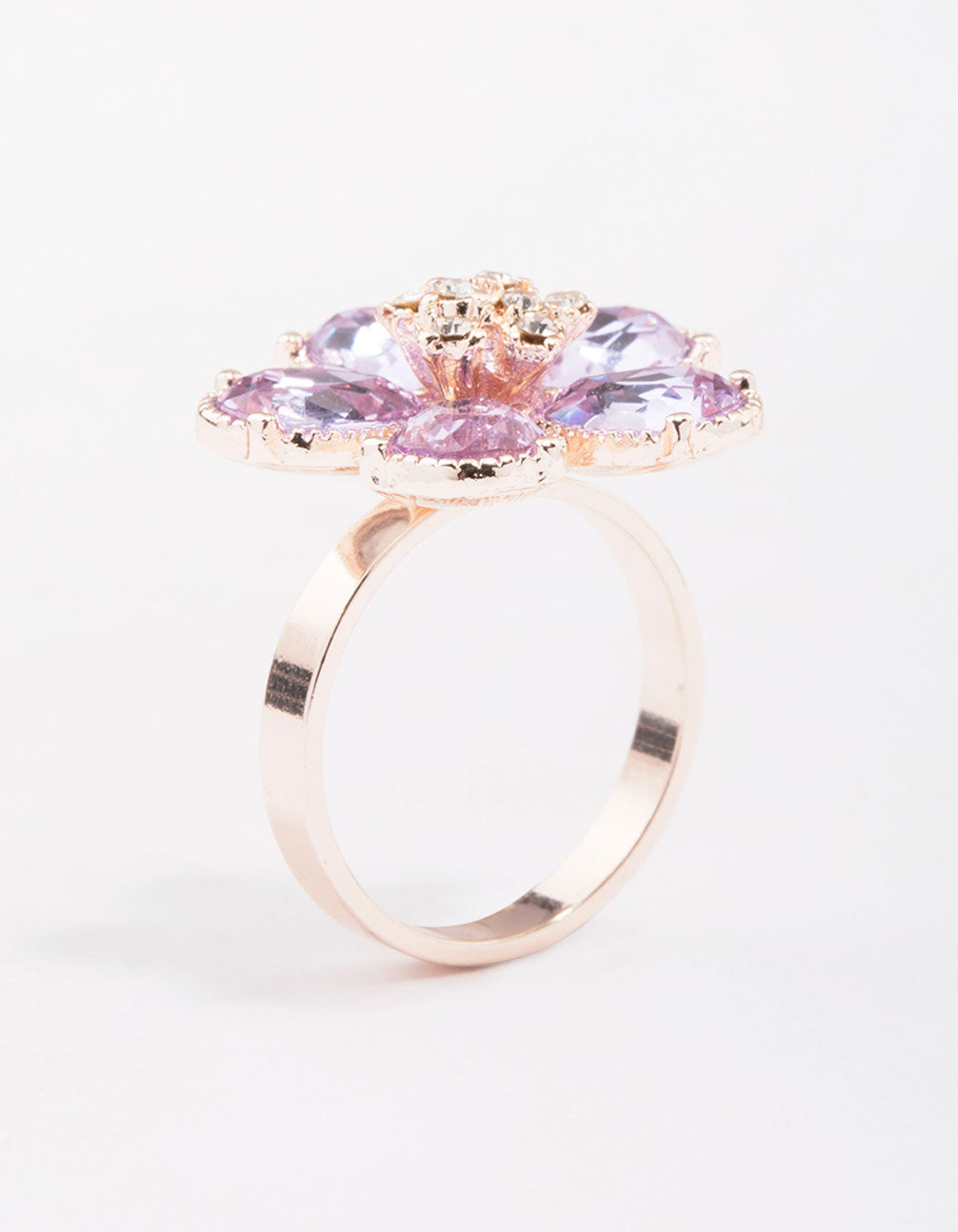 Spice up your stack with this gorgeous, rose gold ring. This cocktail ring features a fine band, adorned with a large lilac flower. Perfect for adding a touch of glamour to your look!