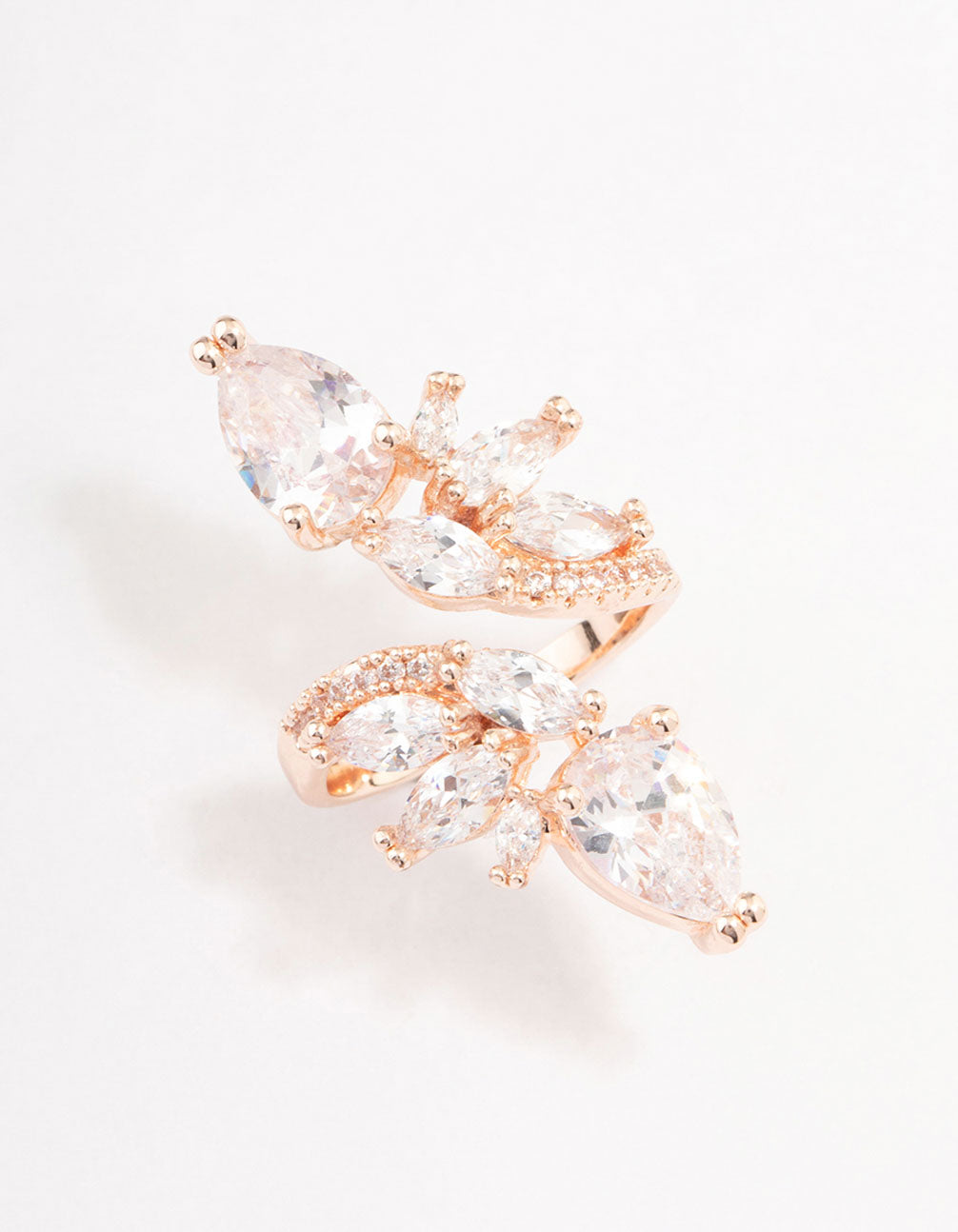 Add warmth to your stack with our selection of refined, rose gold rings. This lovely wrapped ring features an assortment of floral accents and crystals for a touch of glamour.