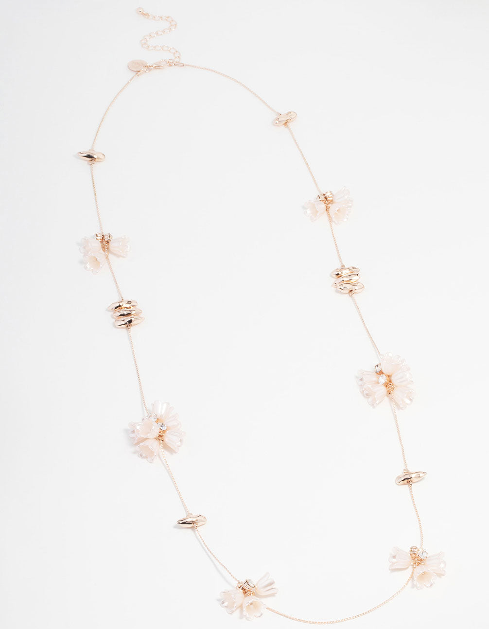 Add a decorative touch to your look with this dainty, rose gold chain necklace. This long necklace features a rose gold setting, adorned with pearlised flower petals for added interest.
