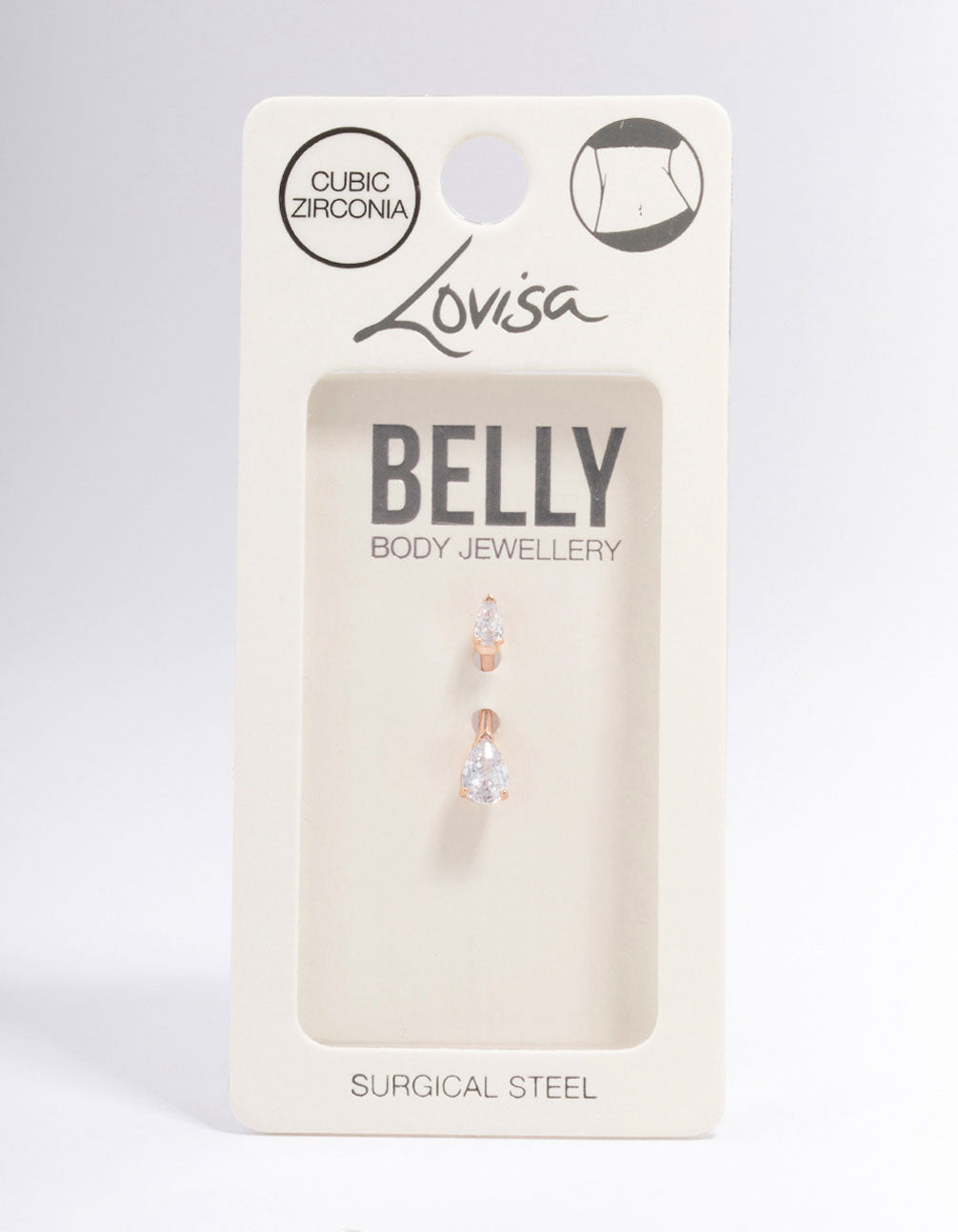 This piercing is plated with real rose gold and features two pear-shaped, cubic zirconia crystals for a hint of glamour.