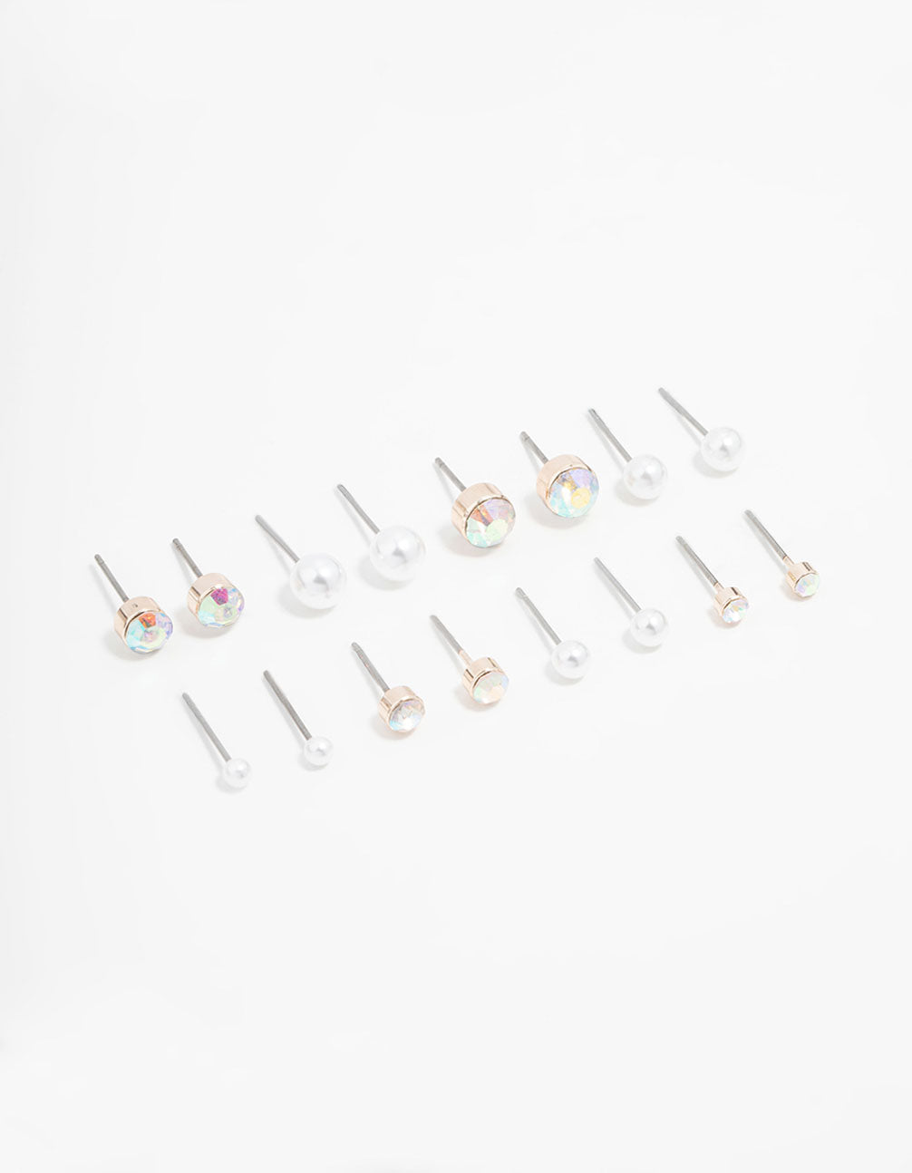 Rose Gold Round Pearl & Aurora Borealis Diamante Stud Earrings 8-Pack