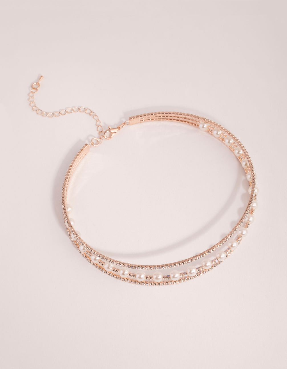 Rose-gold accessories are perfect for creating soft, pretty looks. This stunning choker features three tiered rows with a diamante embellishments. A line of faux pearls adorns the centre row. Layer it with other chains for maximum impact!