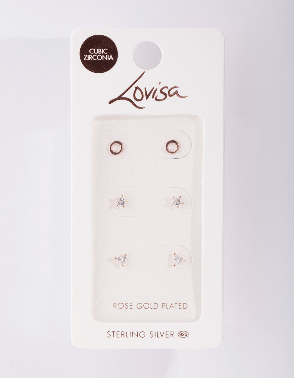 Rose Gold Plated Sterling Silver Cubic Zirconia Geo Stud Earring Pack