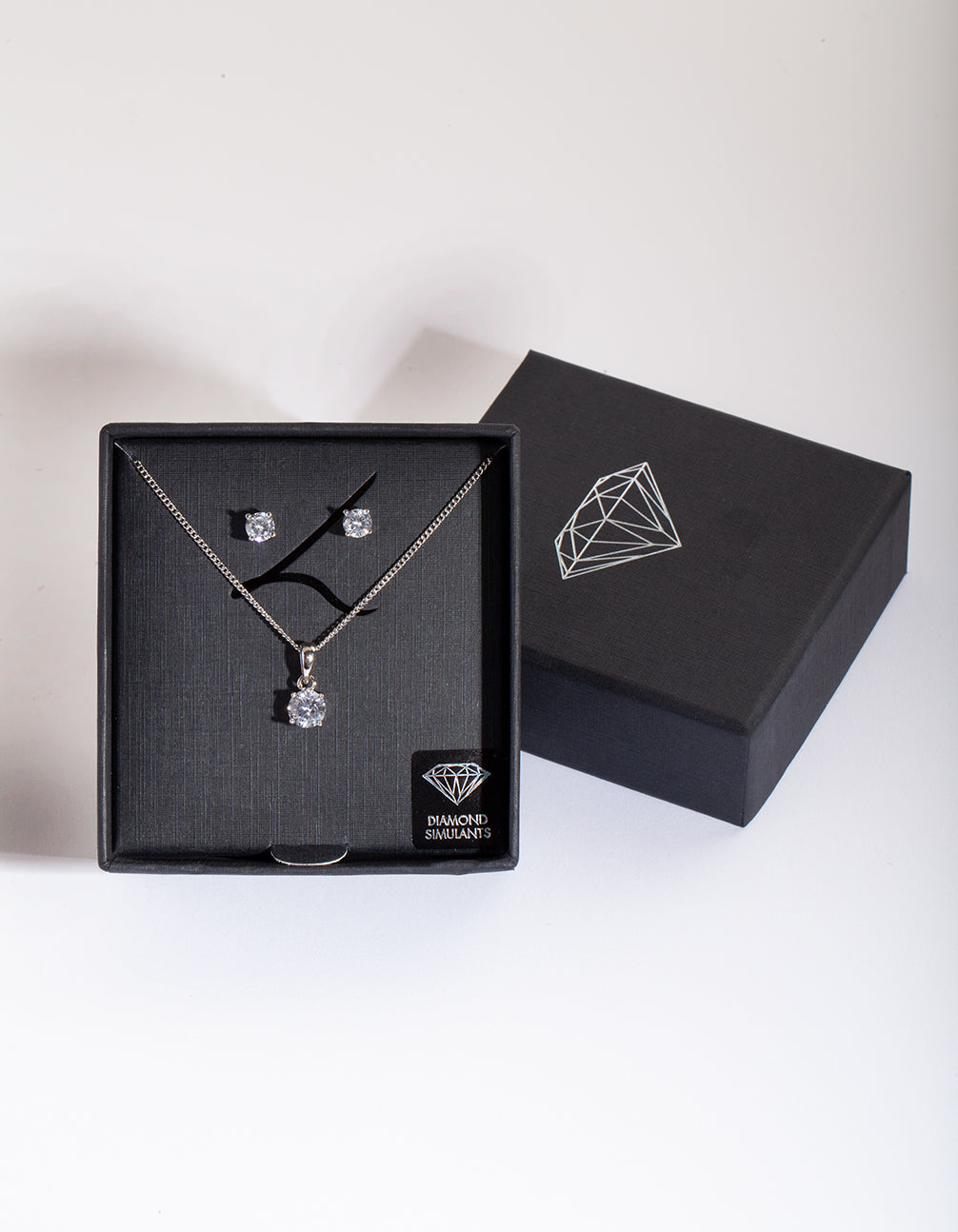 This necklace and earring set is made with diamond simulants, which are designed to be indistinguishable from a true diamond to the naked eye.