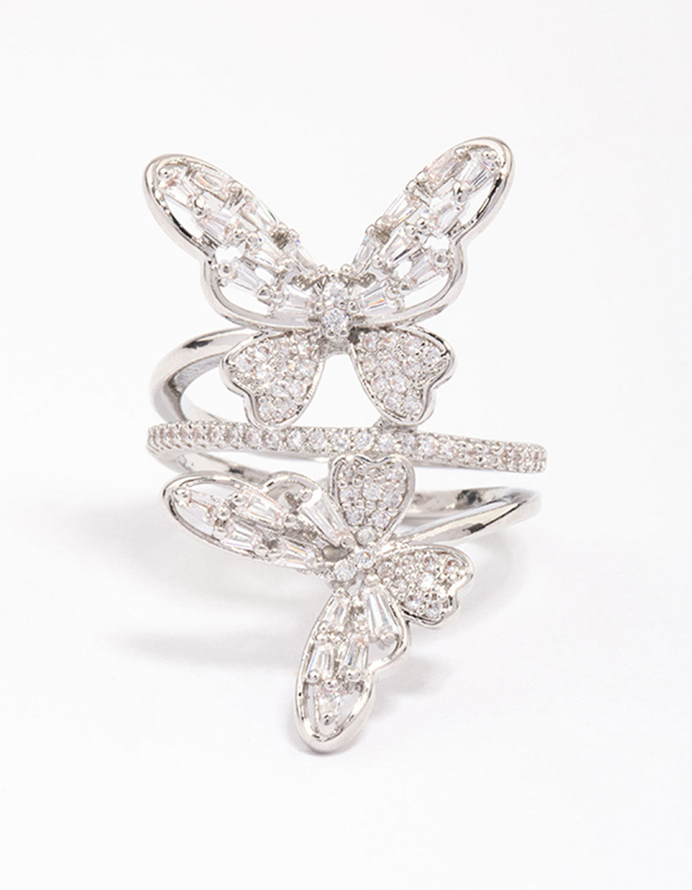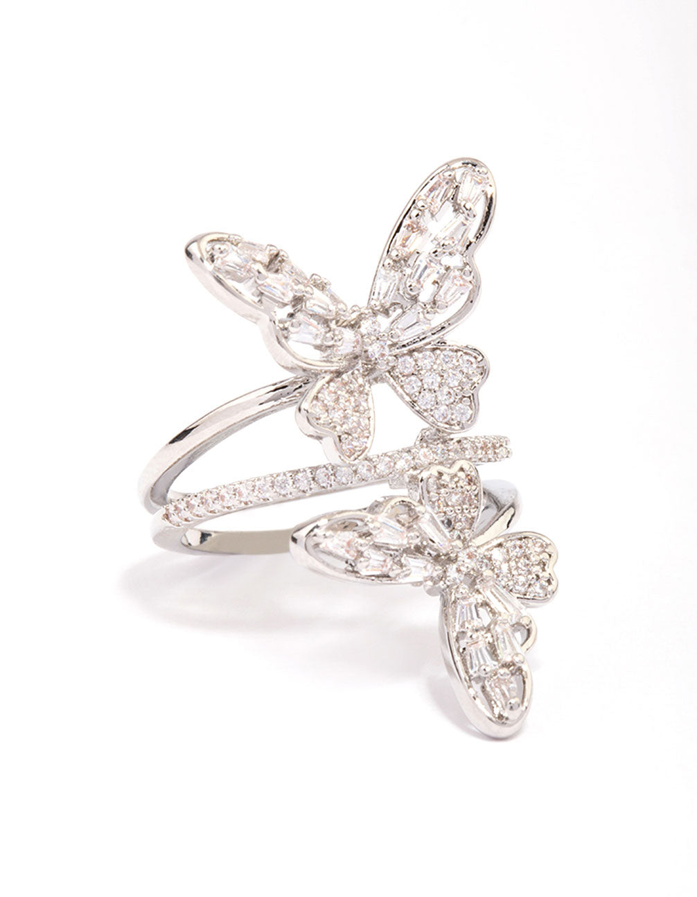 - This engagement-style ring features a silver setting and double butterfly design, embellished with delicate diamantes for a Y2K-inspired look.