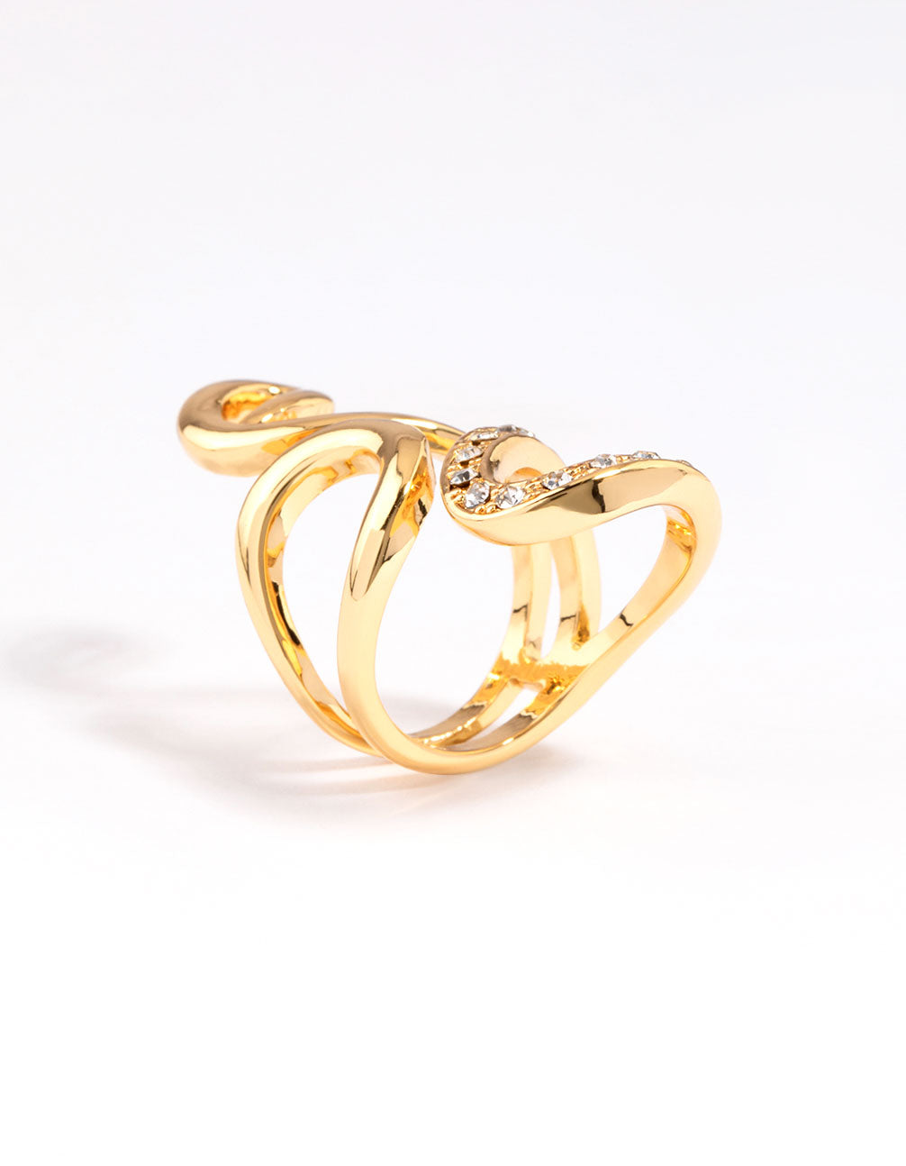 - This gold plated ring features a swirling pattern embellished with crystals for a hint of glamour.