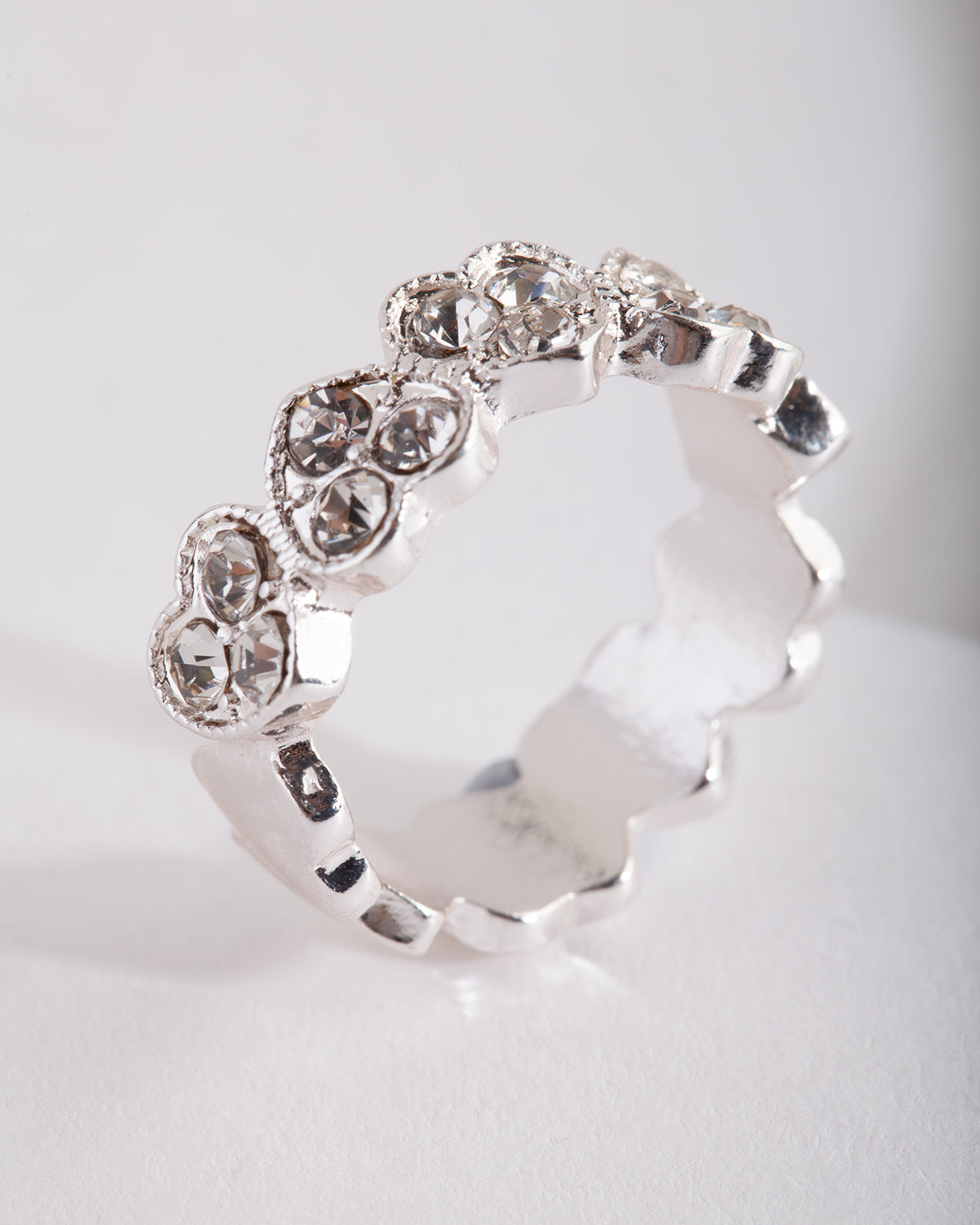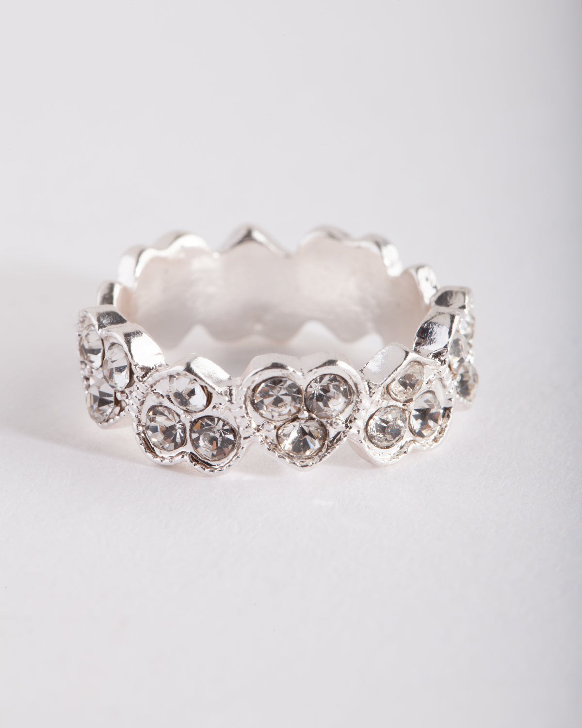 Make a statement in a stunning fashion ring. Stack with other styles for extra impact or wear alone for a refined addition to your ensemble. This ring features a silver-tone setting with diamante encrusted hearts surrounding it.