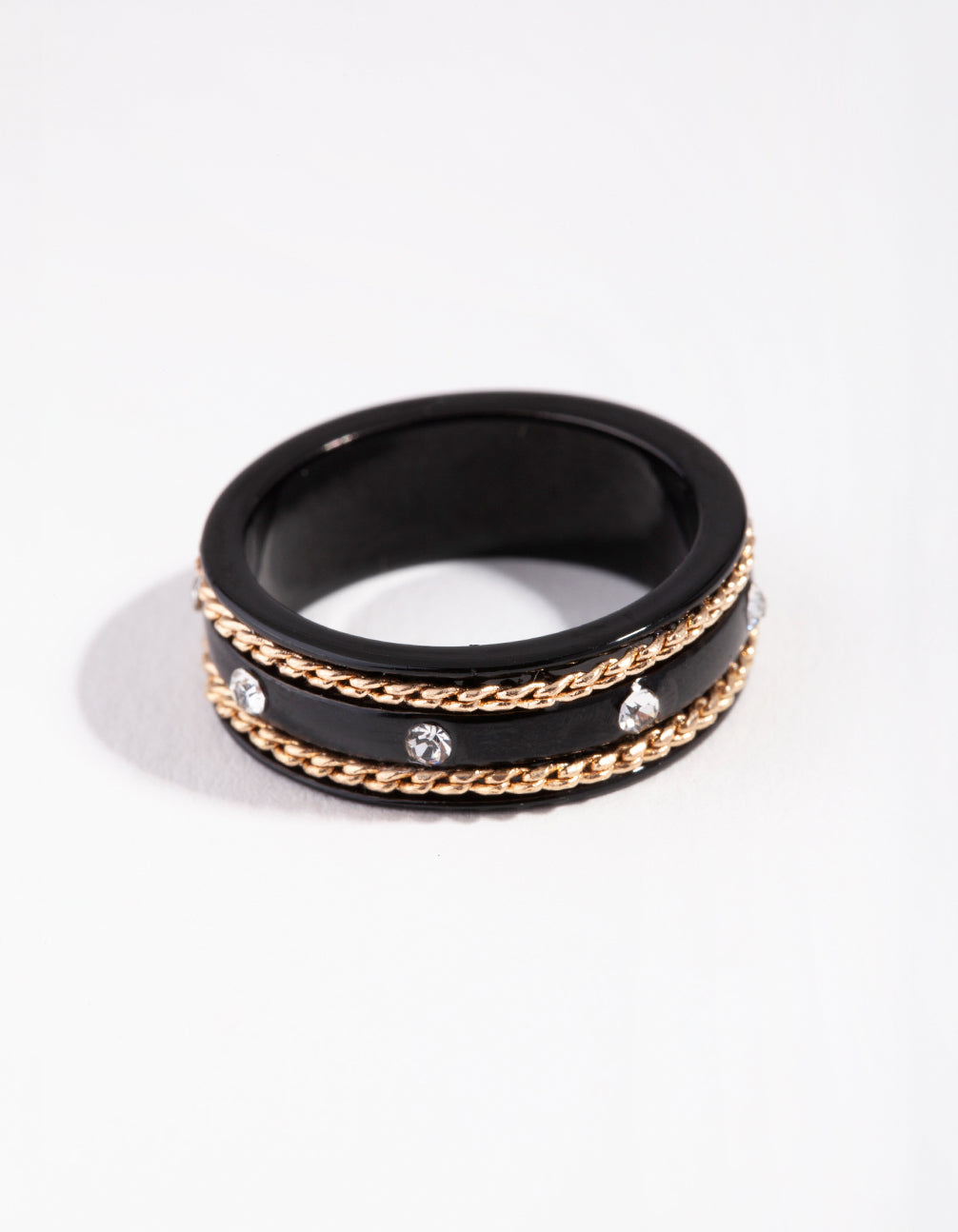 Step into summer with playful rings with major 90s vibes Ð perfect for festivals, summer nights or lounging poolside. This black ring features a gold chain design and is studded with delicate diamantes. Stack it with other vintage-inspired rings for a fun and funky look!