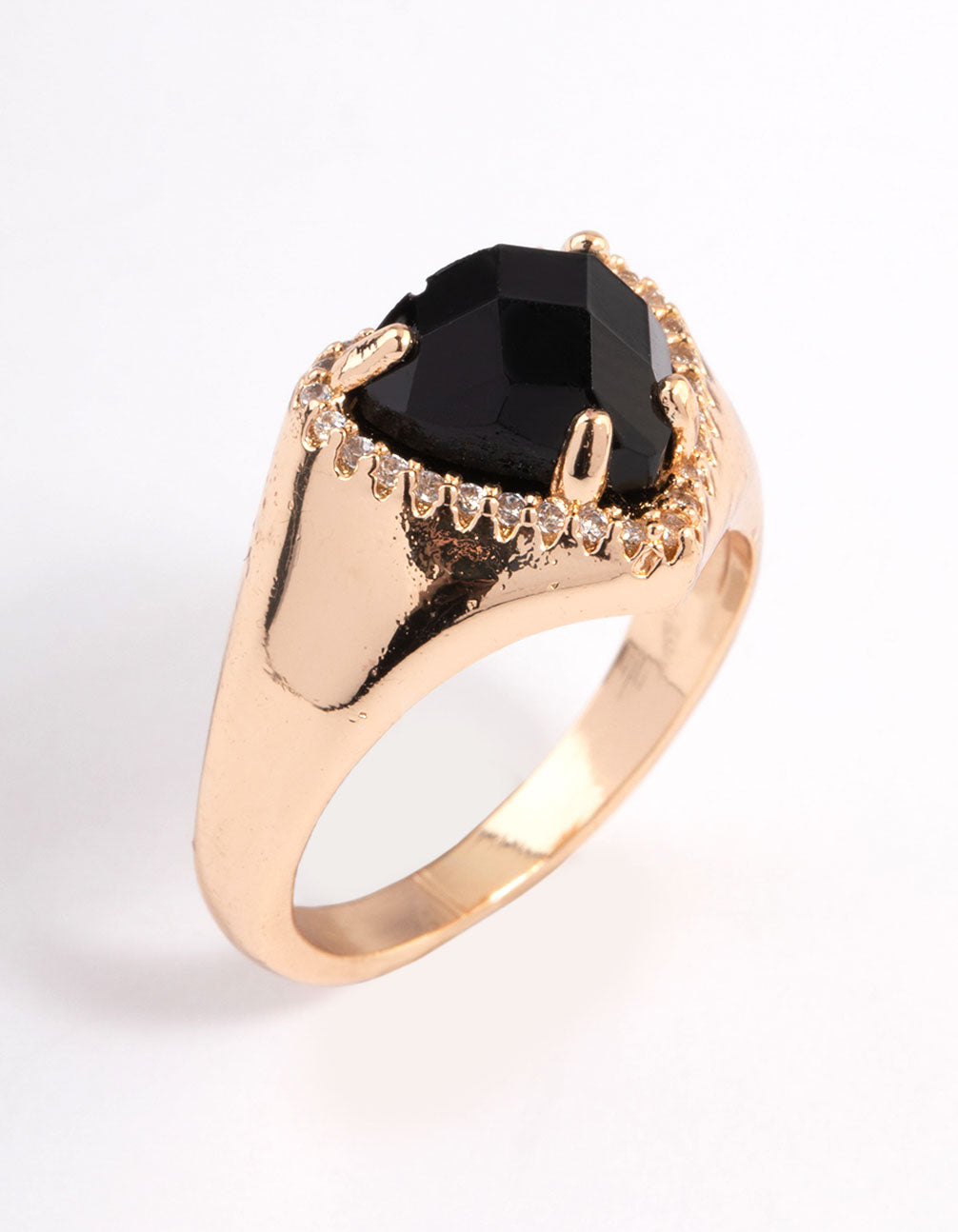 - Stye this black and gold heart motif statement ring with a pair of heart huggie hoops for a loveable look.