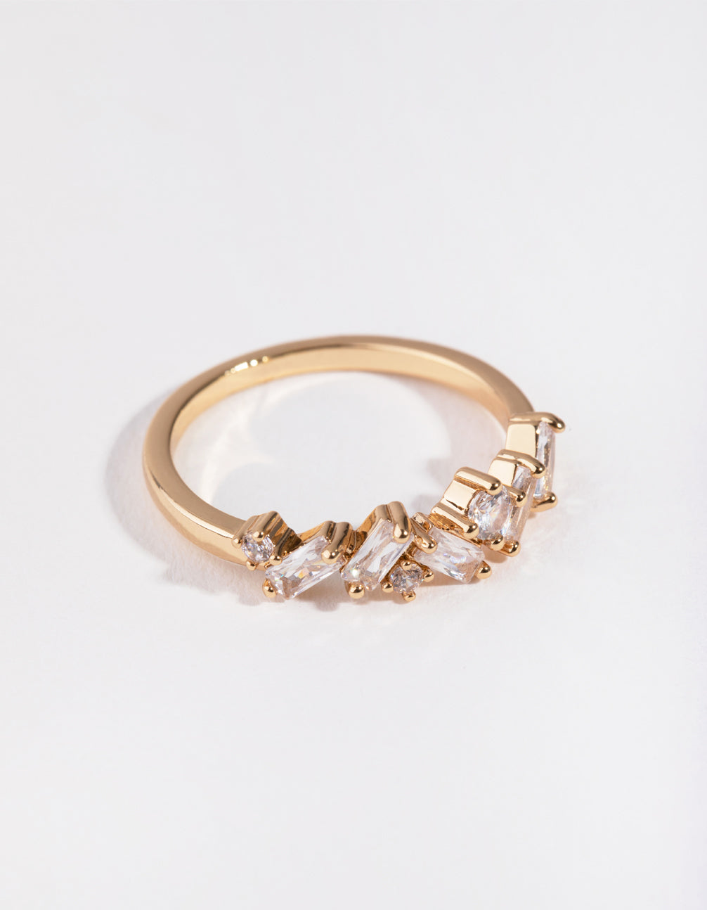 Dazzle and shine with captivating cubic zirconias. This gold-tone ring features a row of stunning cubic zirconia stones, which are cut and designed to look just like a true diamond. Pair this with any outfit for a graceful, luxurious finish.