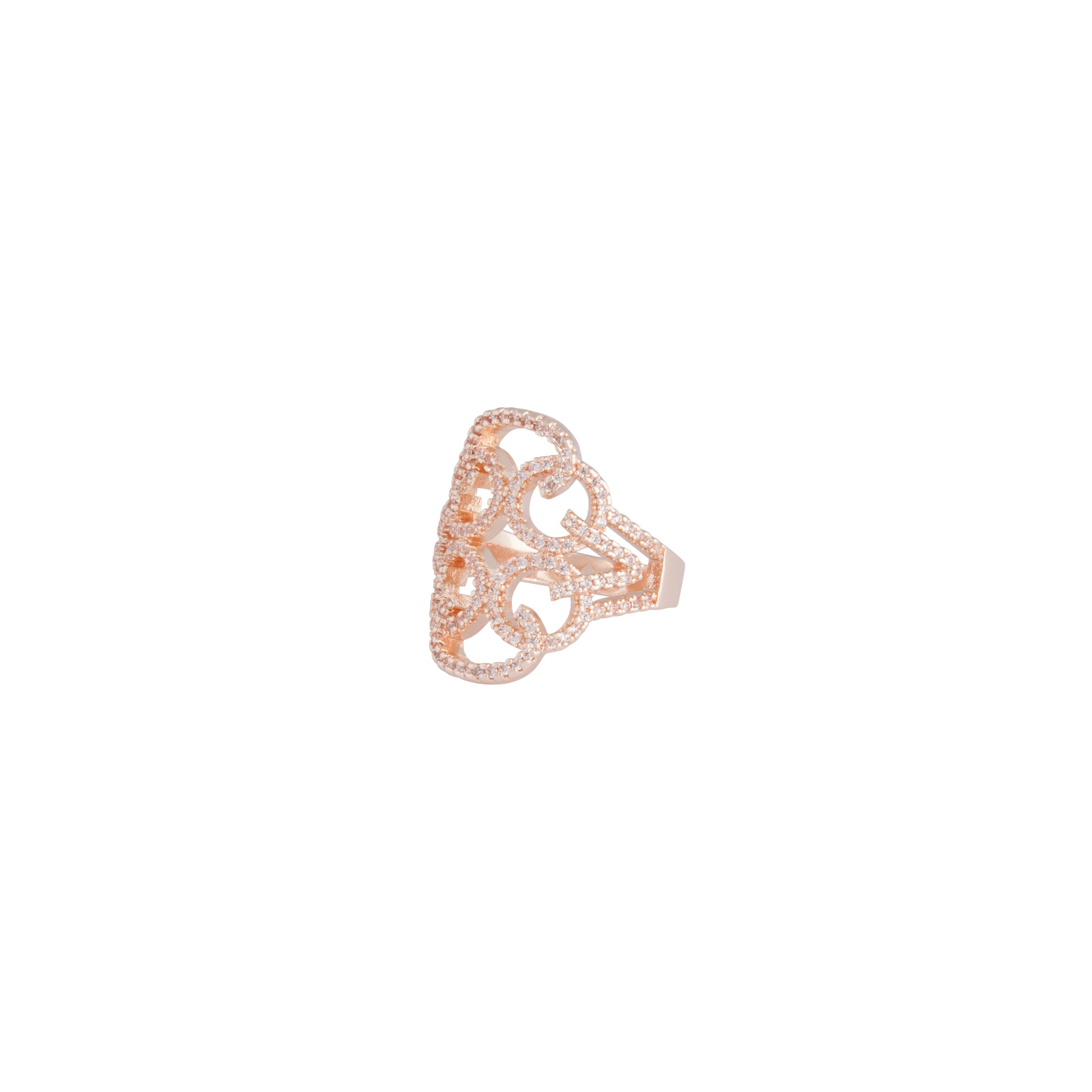 This rose gold toned ring has an intricate cut-out design and is encrusted with cubic zirconia's.