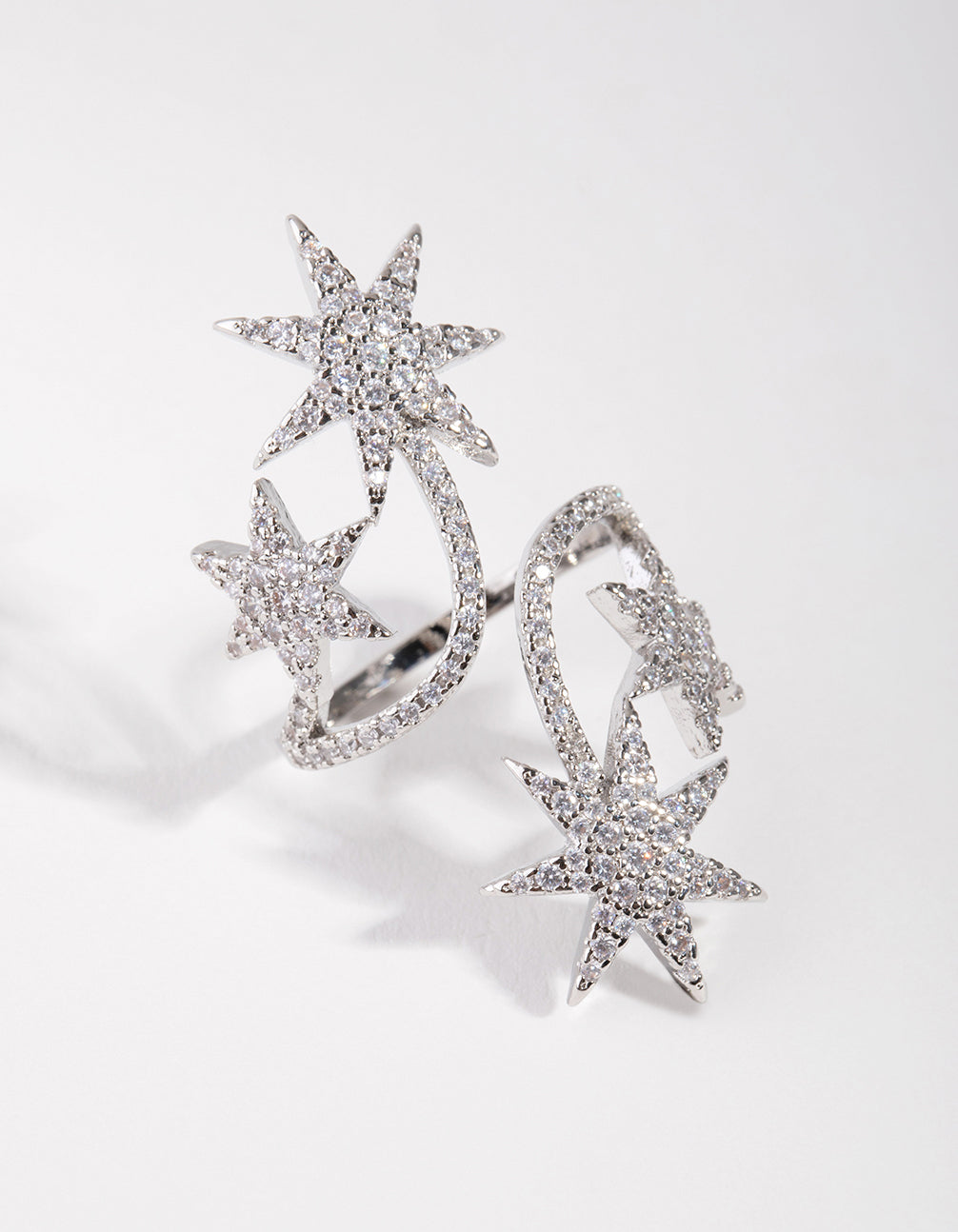 Add some luxury to your look with rings featuring cubic zirconia stones, which sparkle with the clarity and brilliance of a true diamond. This ring features an intricate wrap-around design with large shining stars. Enjoy some bling on your ring!