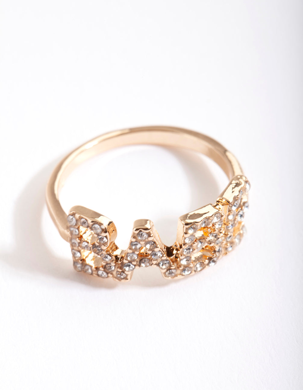 Make a statement in a stunning fashion ring. Stack with other styles for extra impact or wear alone for a refined addition to your ensemble. This ring features a gold toned setting with the word "babe" written in diamantes.