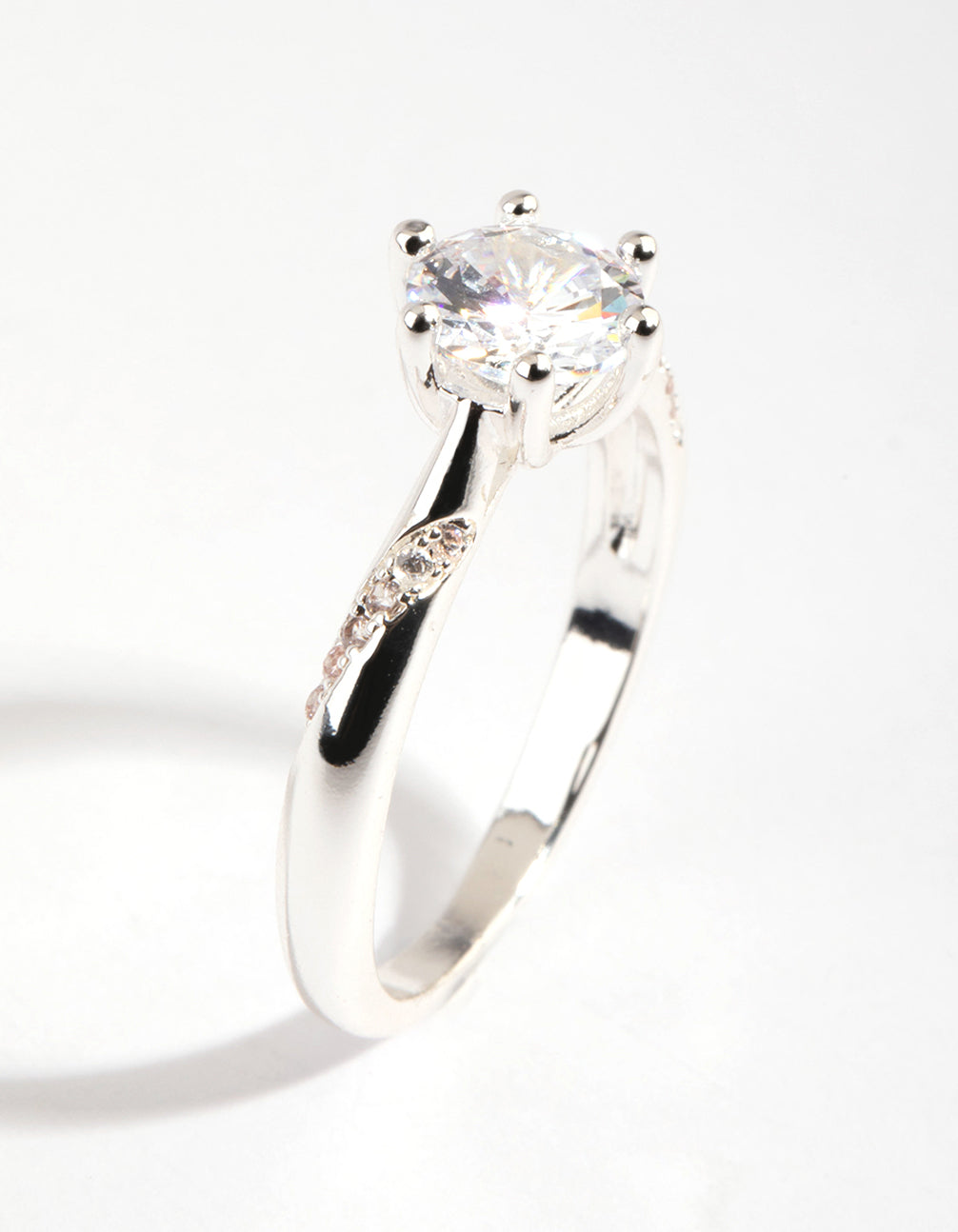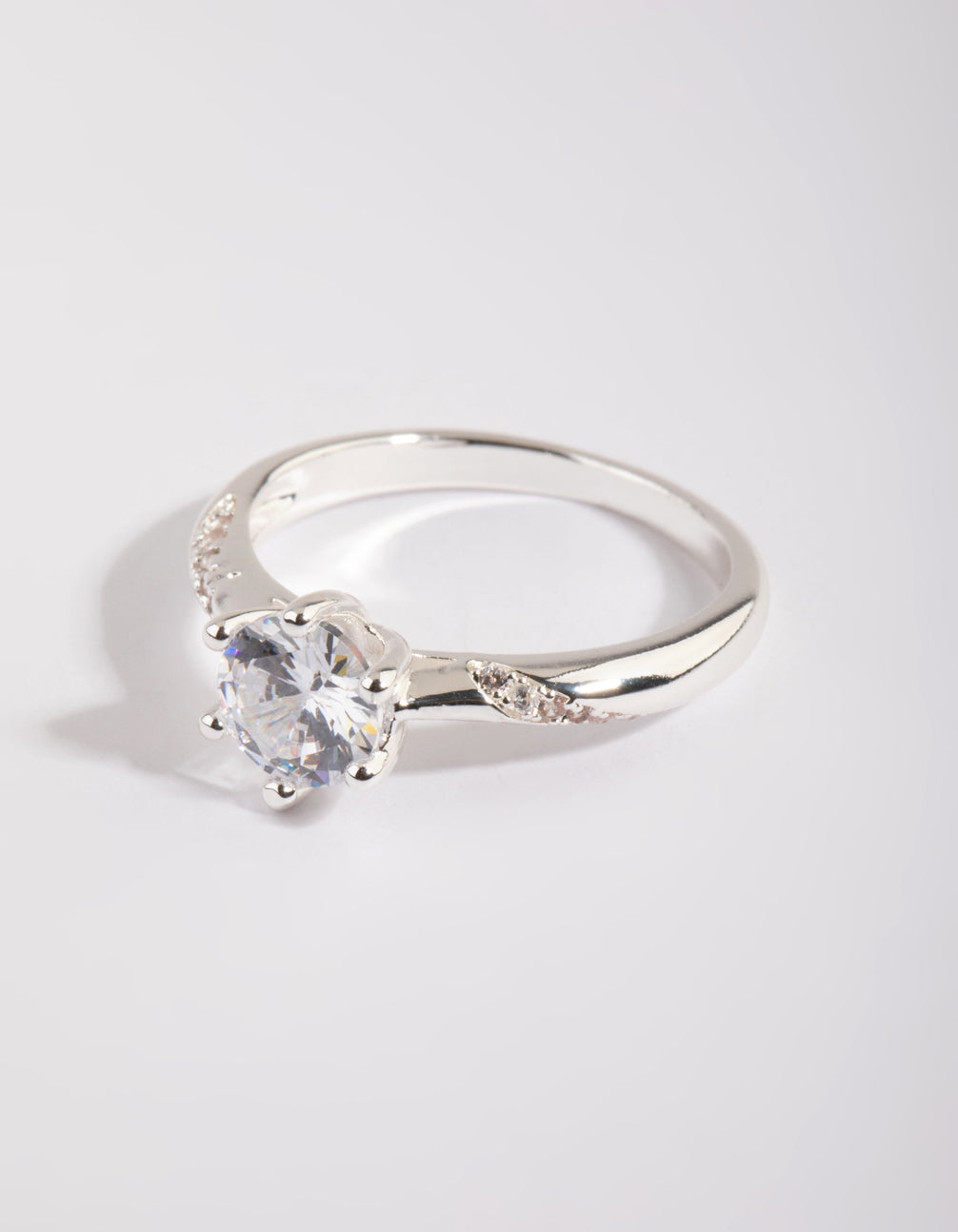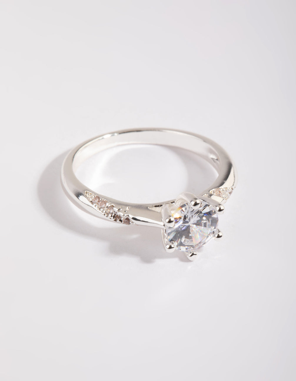 This stunning engagement-style ring has been plated with genuine silver for authentic lustre and shine. It features a statement cubic zirconia crystal, which will dazzle when it hits the light. Cubic zirconia crystals have been specifically created to resemble the cut, colour and clarity of true diamonds. Wear this ring and make and impression, or gift it to a special someone.