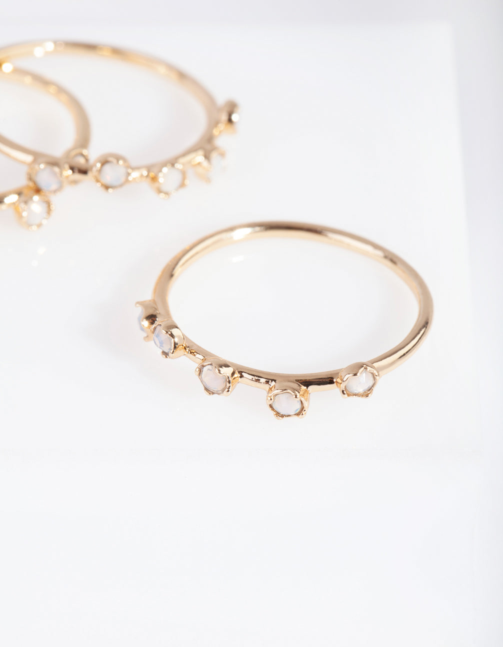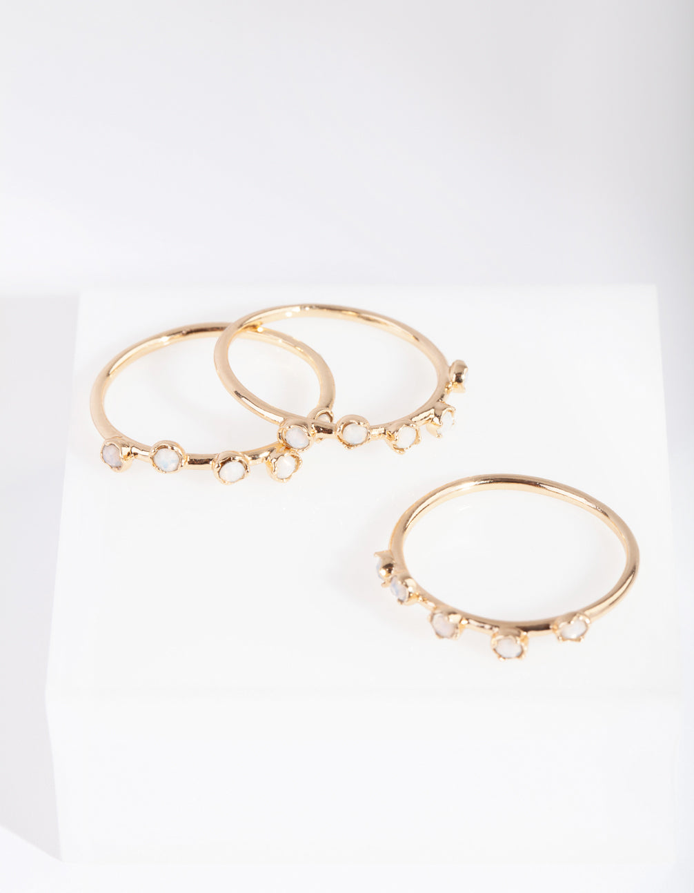 Mix and match with our ring packs! Stackable rings allow you to create your own personalised looks. This pack comes with a variety of gold-toned styles adorned with opals featuring a thin band design.