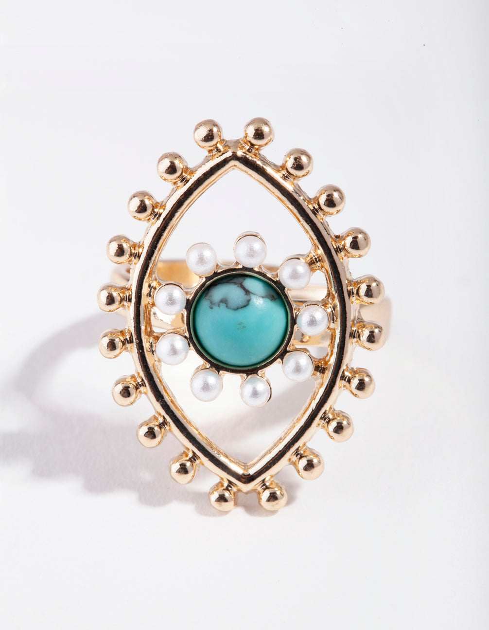 Step into summer with playful rings that have major 90s vibes Ð perfect for festivals, summer nights or lounging poolside. This gorgeous gold-toned ring features a large evil eye design with a turquoise pupil and faux pearl irises. Stack it with other retro-inspired rings for a fun and funky look!