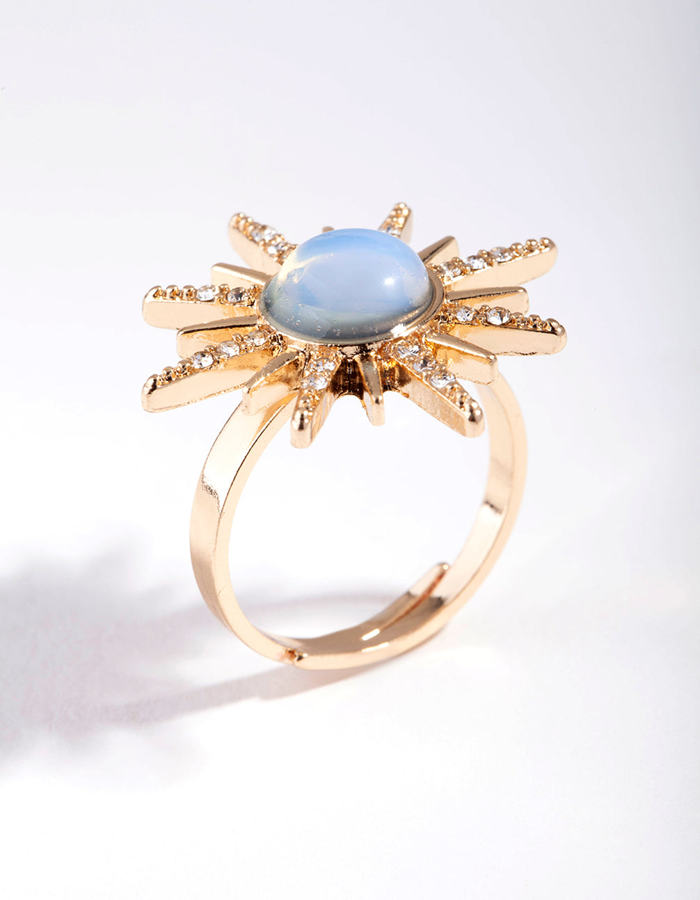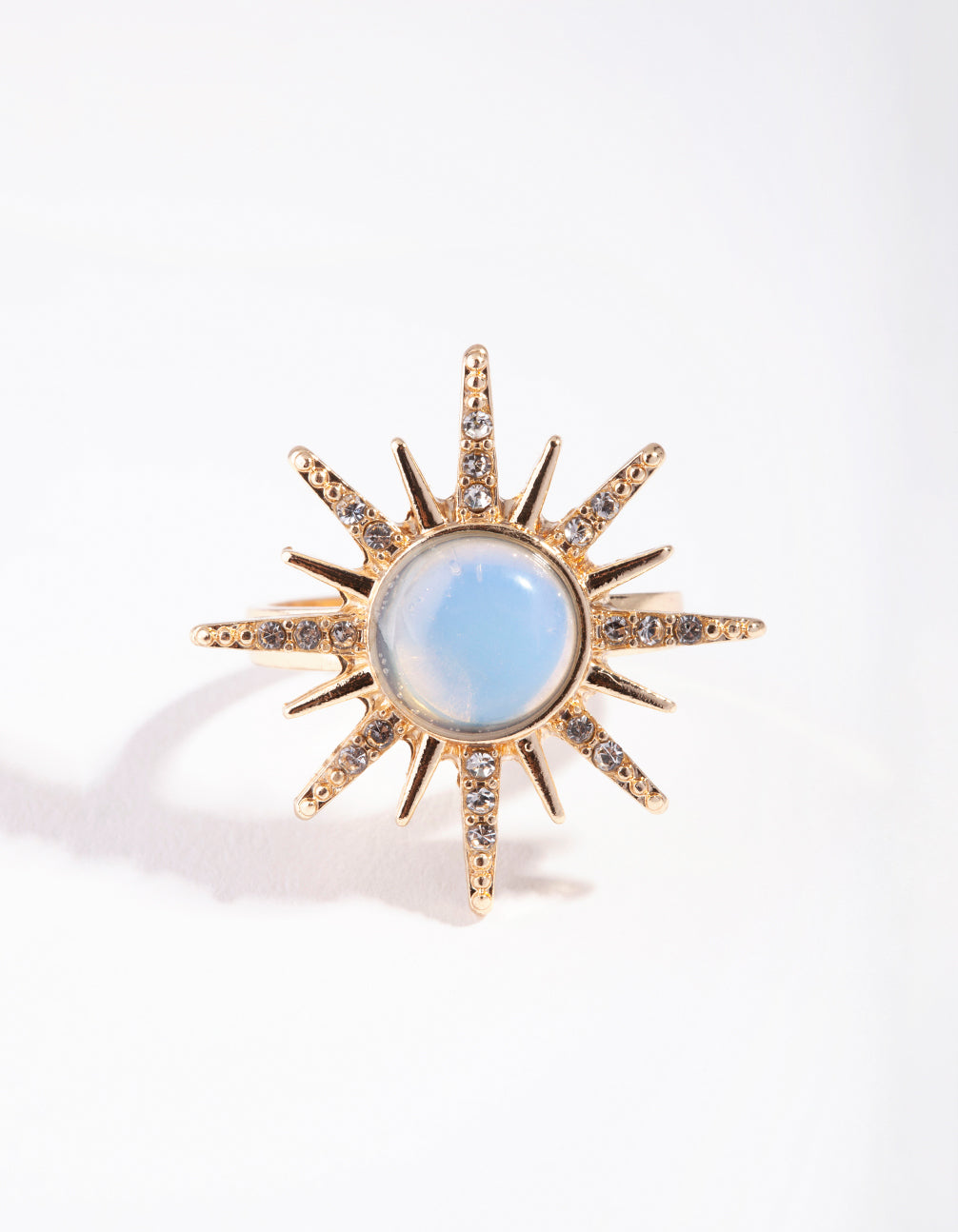 Invest in some vintage-style rings to add some retro glam to your looks! This gorgeous gold-toned ring features an ornate sun design with a milky stone at its centre and glittering diamantes on the sunÕs rays. Gorgeous!