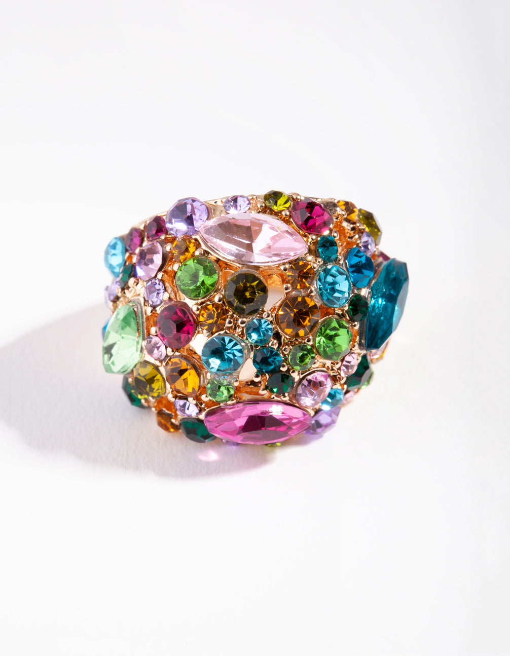 Shine bright with this stunning gold-toned ring, which features an extravagant glittering diamante design with bright multicoloured crystals. This ring has a vintage glam vibe, and is the perfect piece to pay homage to the 90s, wear to festivals or just to welcome the summer season.