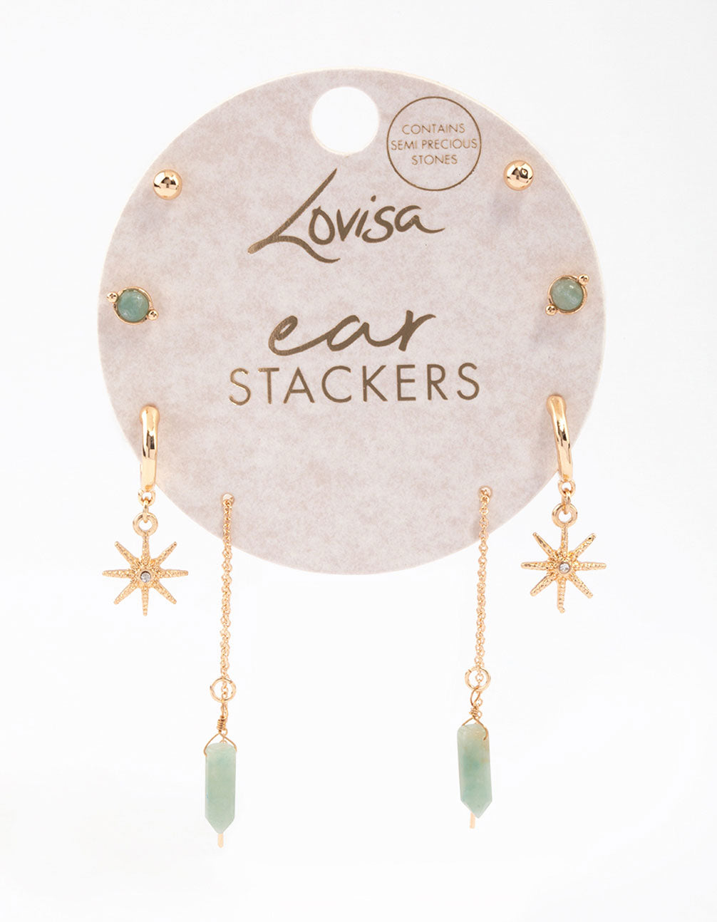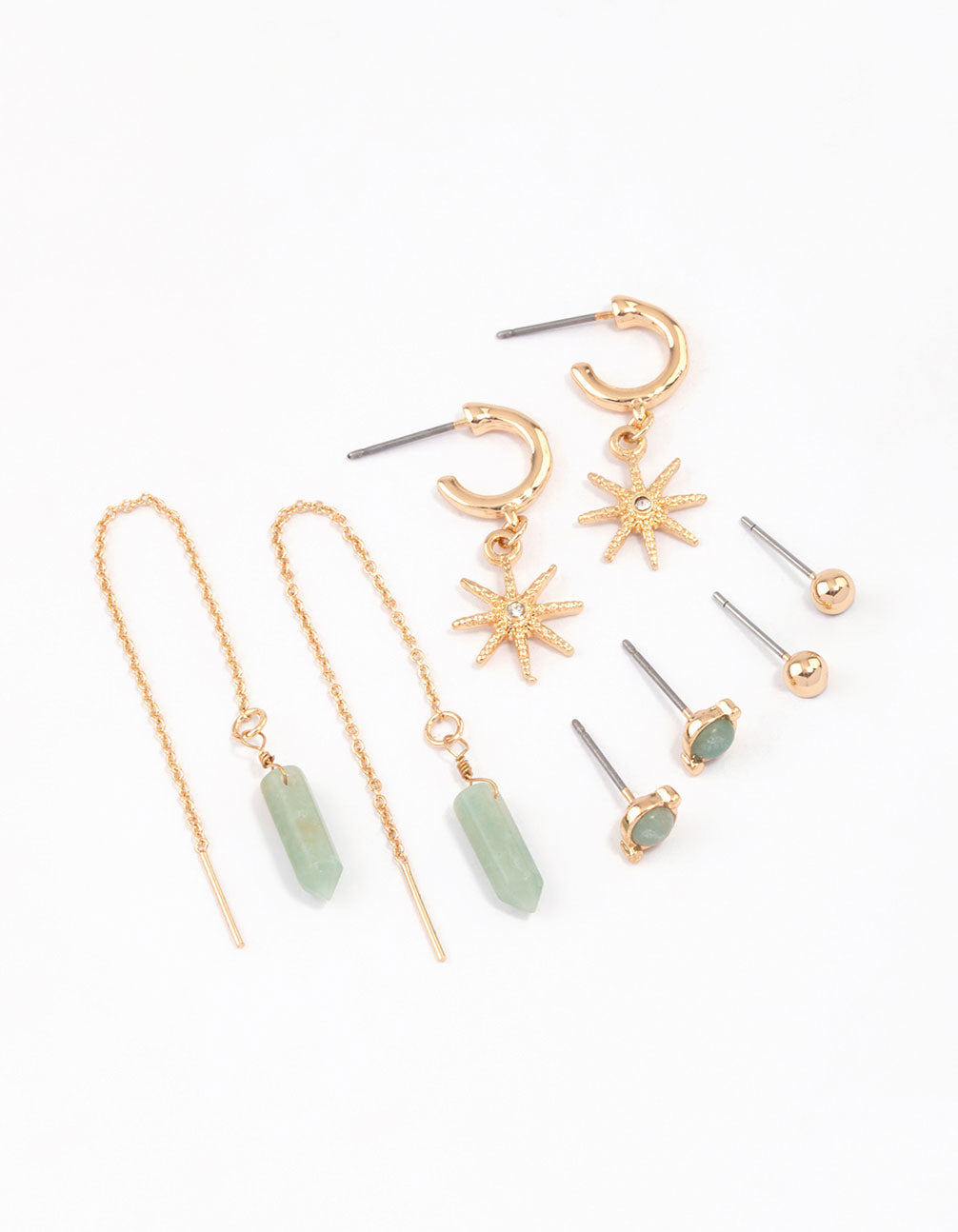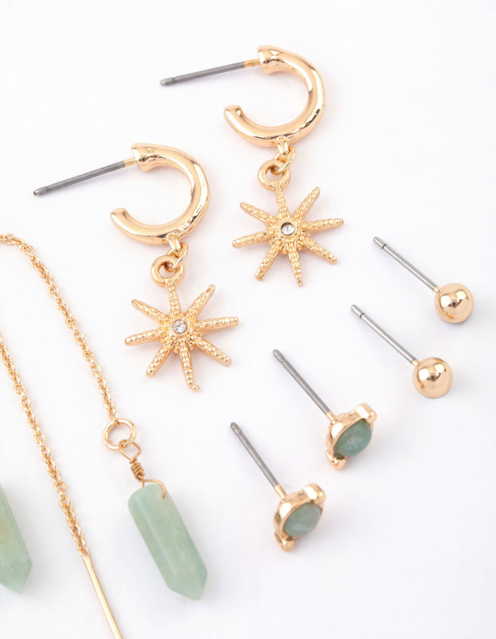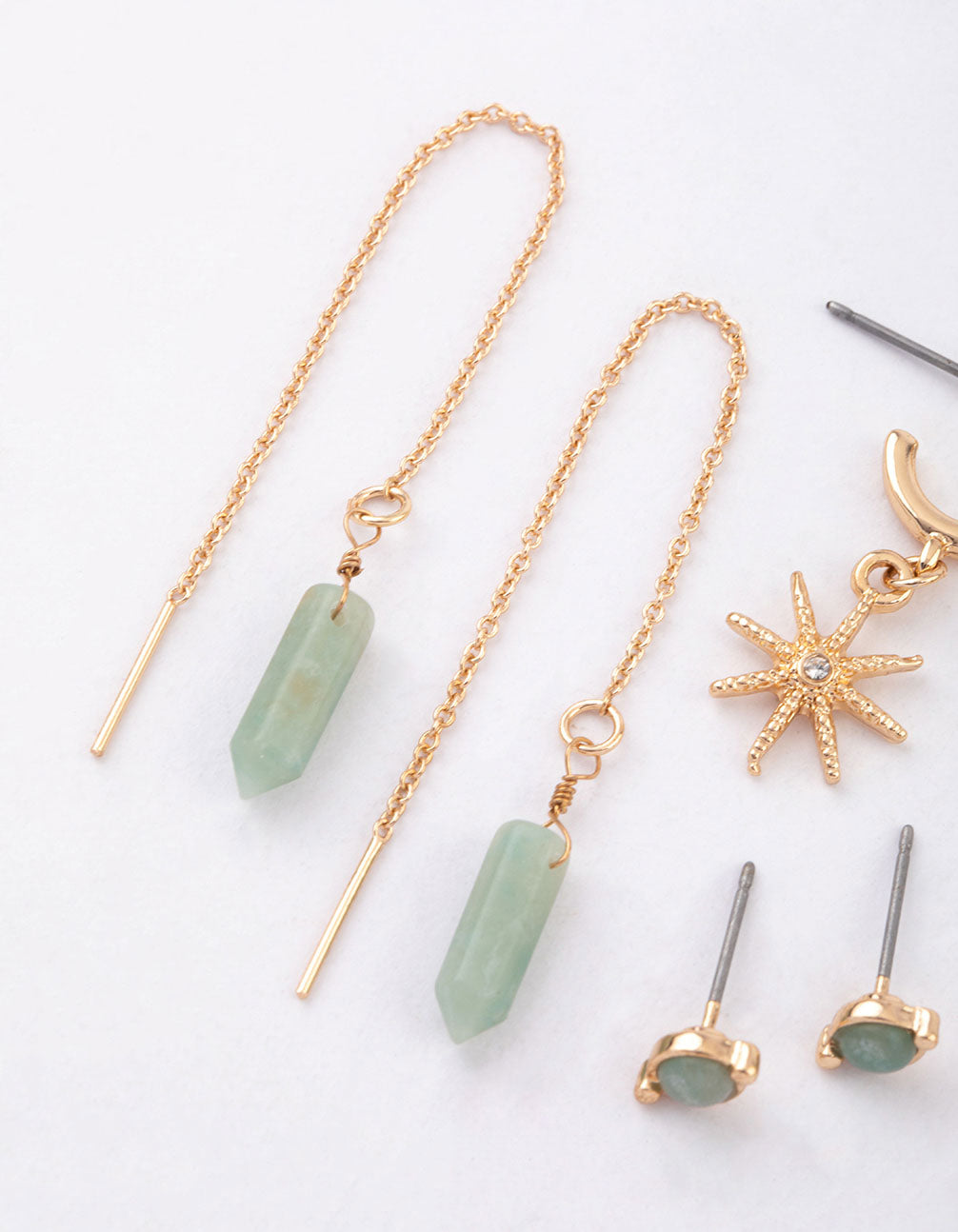 - Semi-Precious stones are natural minerals, each with their own properties and meaning. Style this pack of Gold Mixed Celestial & Thread Through Earrings and channel good vibes all day long!