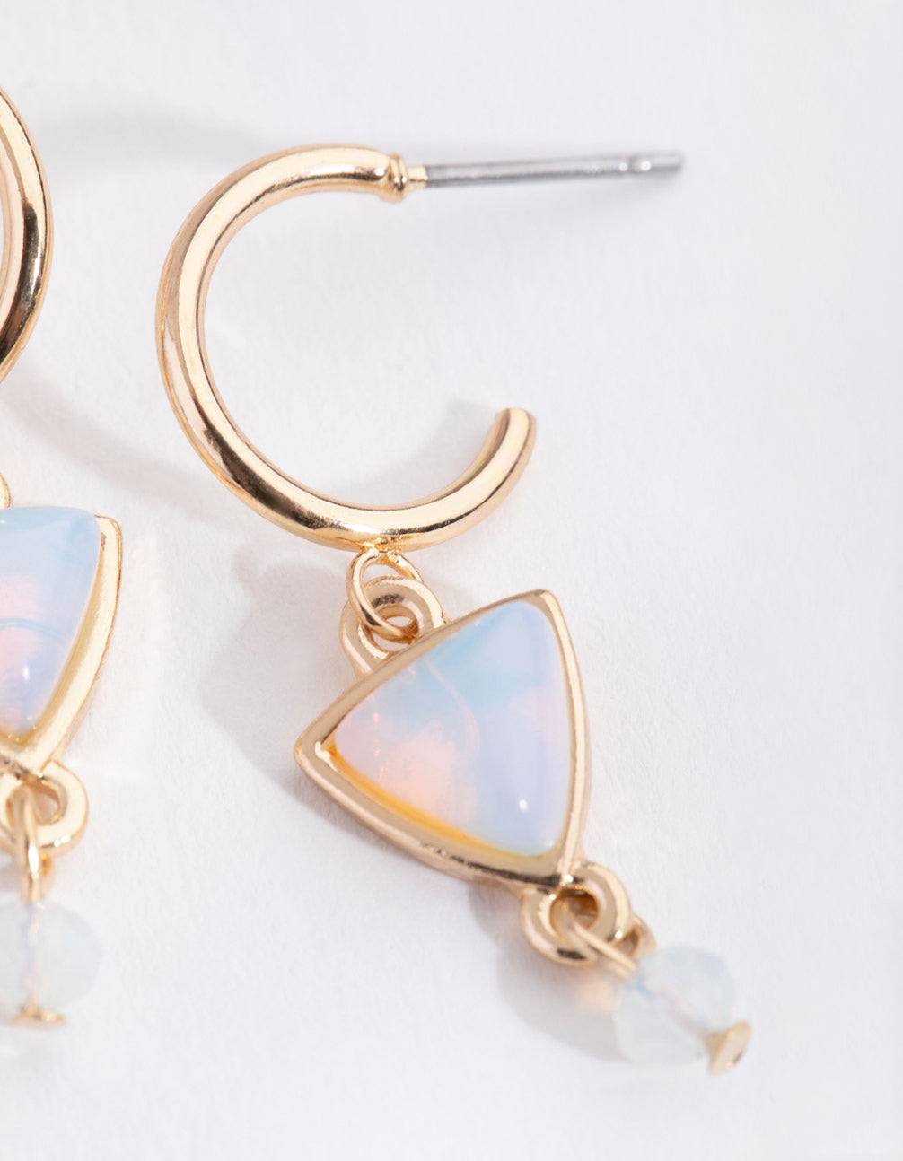 Discover the Semi-Precious Collection, which features curated jewellery with semi-precious stone elements made to balance and restore. These huggie hoops are gold toned, and feature a hanging design with milky-hued stones at their centre. Wear them with natural tones for a luxury day-spa-inspired look.