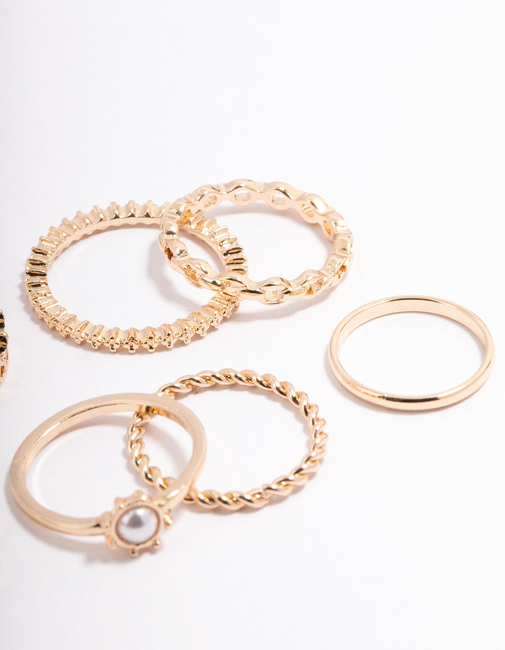 - This ring pack contains a set of dainty, gold-toned rings and features pearl and crown-inspired detailing for a romantic finish.