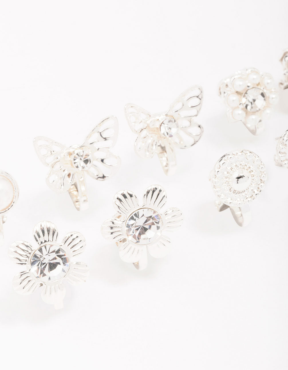 This set of clip on earrings includes five pairs of silver-toned studs, each adorned with butterfly and flower motifs for an ethereal touch.